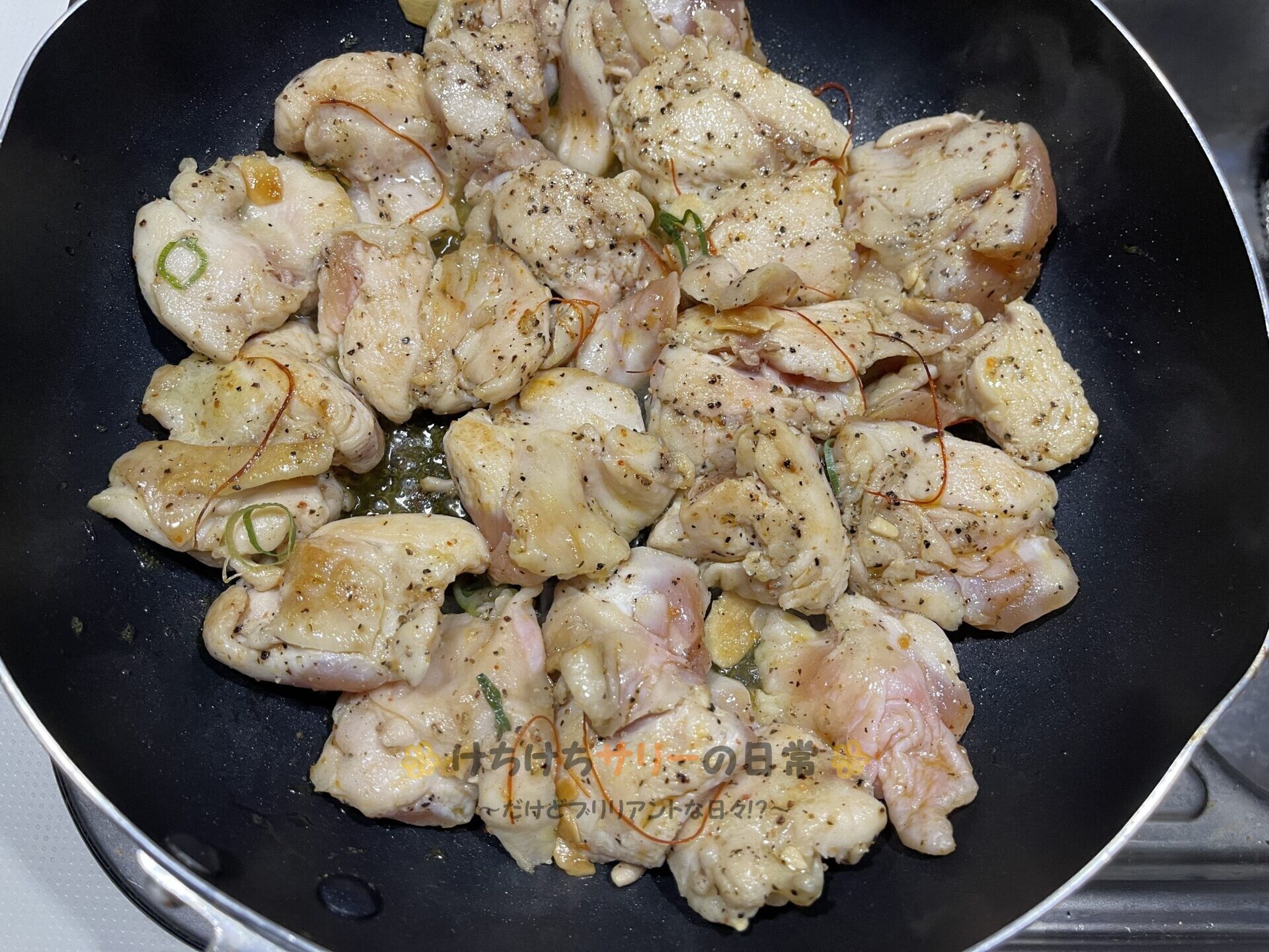 鶏肉なのでフライパンでじっくりと焼いたら出来上がり(写真は焼いている途中のもの)!!