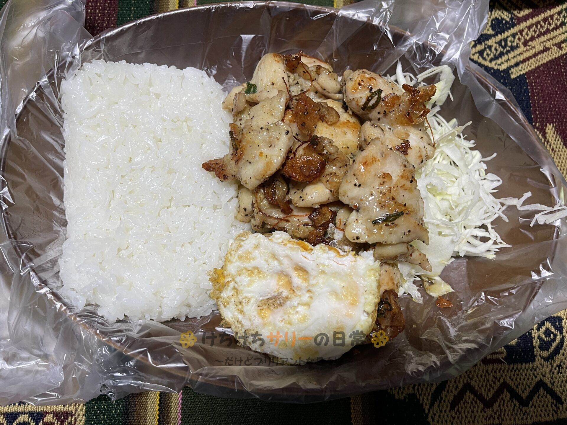 この日の夕ご飯は「ご飯」、「若鶏肩小肉味付焼肉ガーリックペッパー味~キャベツを添えて~」、「目玉焼き」だよ。