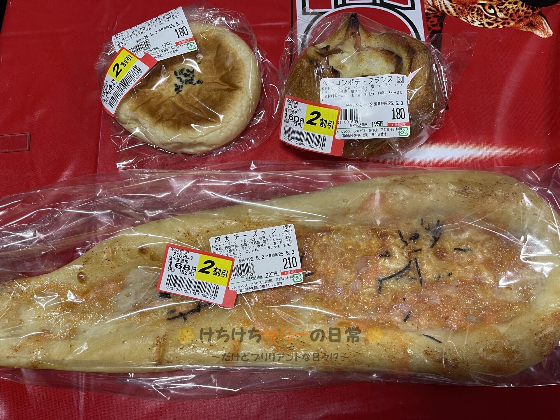 この日のお昼ご飯は先ほどアルビスで購入したパン各種。 朝ラーを楽しんだ事もあってそんなにお腹が空いてなかったから、「明太チーズナン:2割引きで182円」、「ベーコンポテトフランス:2割引きで173円」、「あんパン:2割引きで156円」を2人で半分ずつ食べたよ🥐