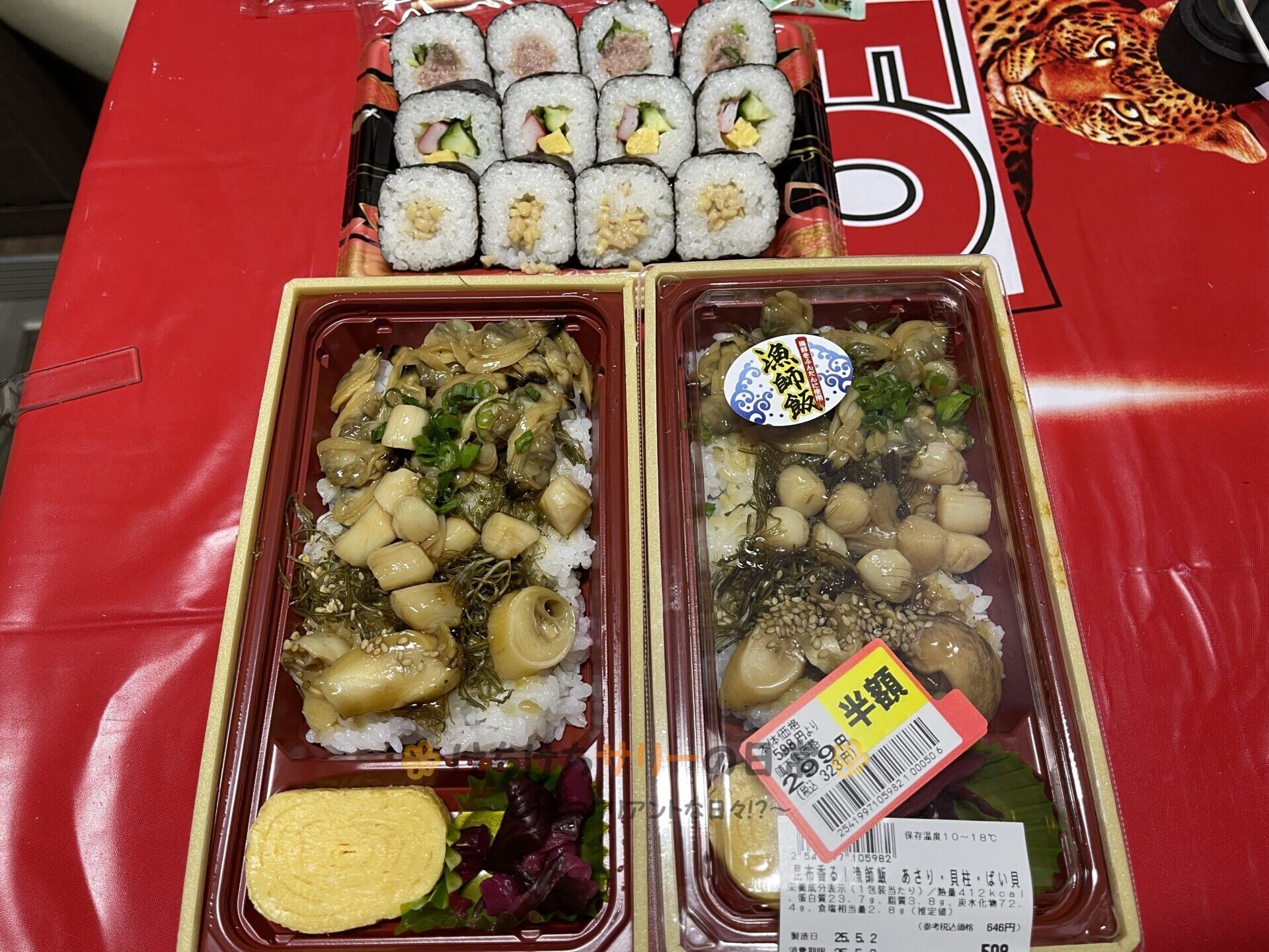 この日の夕ご飯は「昆布香る!漁師飯 あさり・貝:半額で323円」×2個と「人気中巻寿司アソート:半額で269円」だよ。