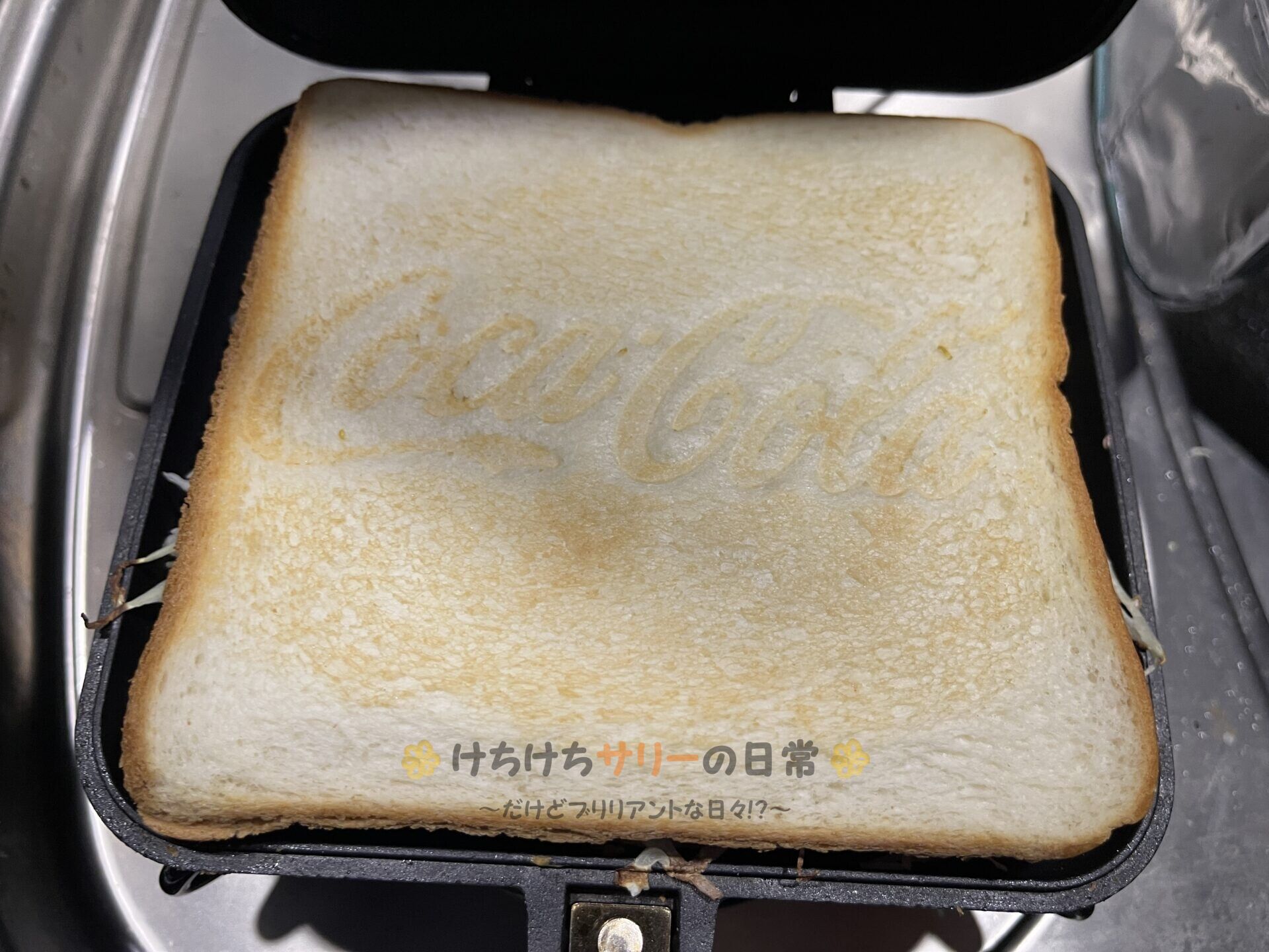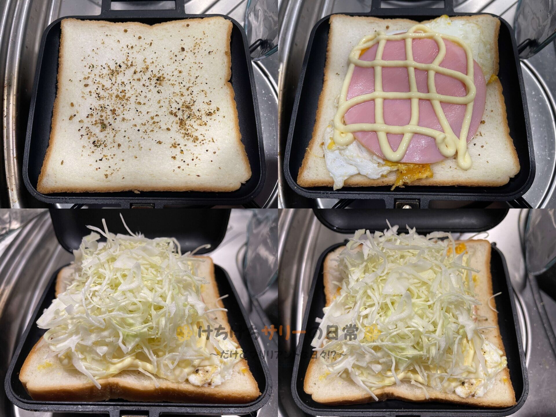 この日の夕ご飯は例のアレ😁 食パンに玉子焼きやハム、チーズにキャベツをのせてホットサンドを作る。