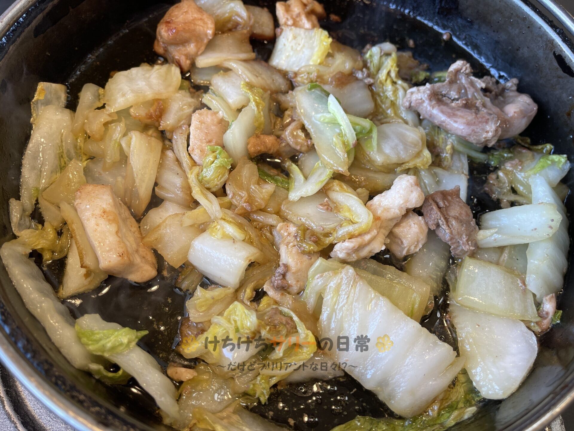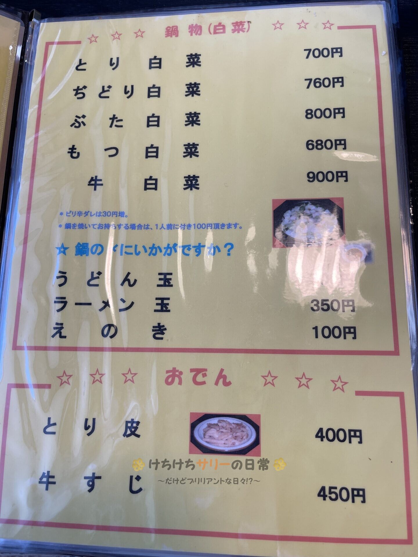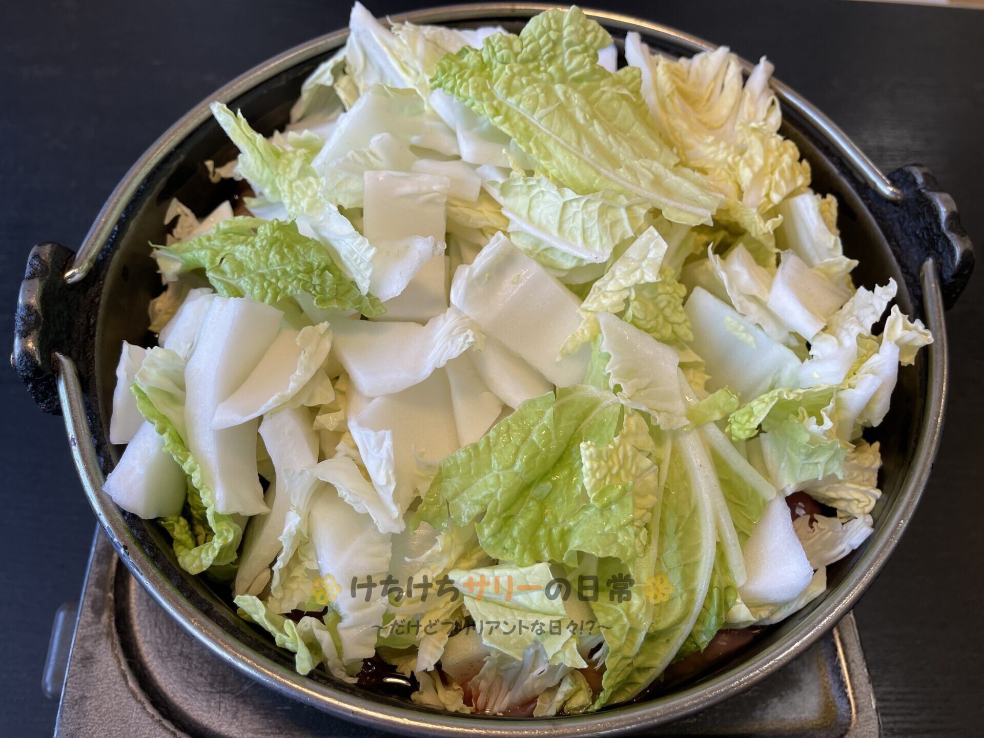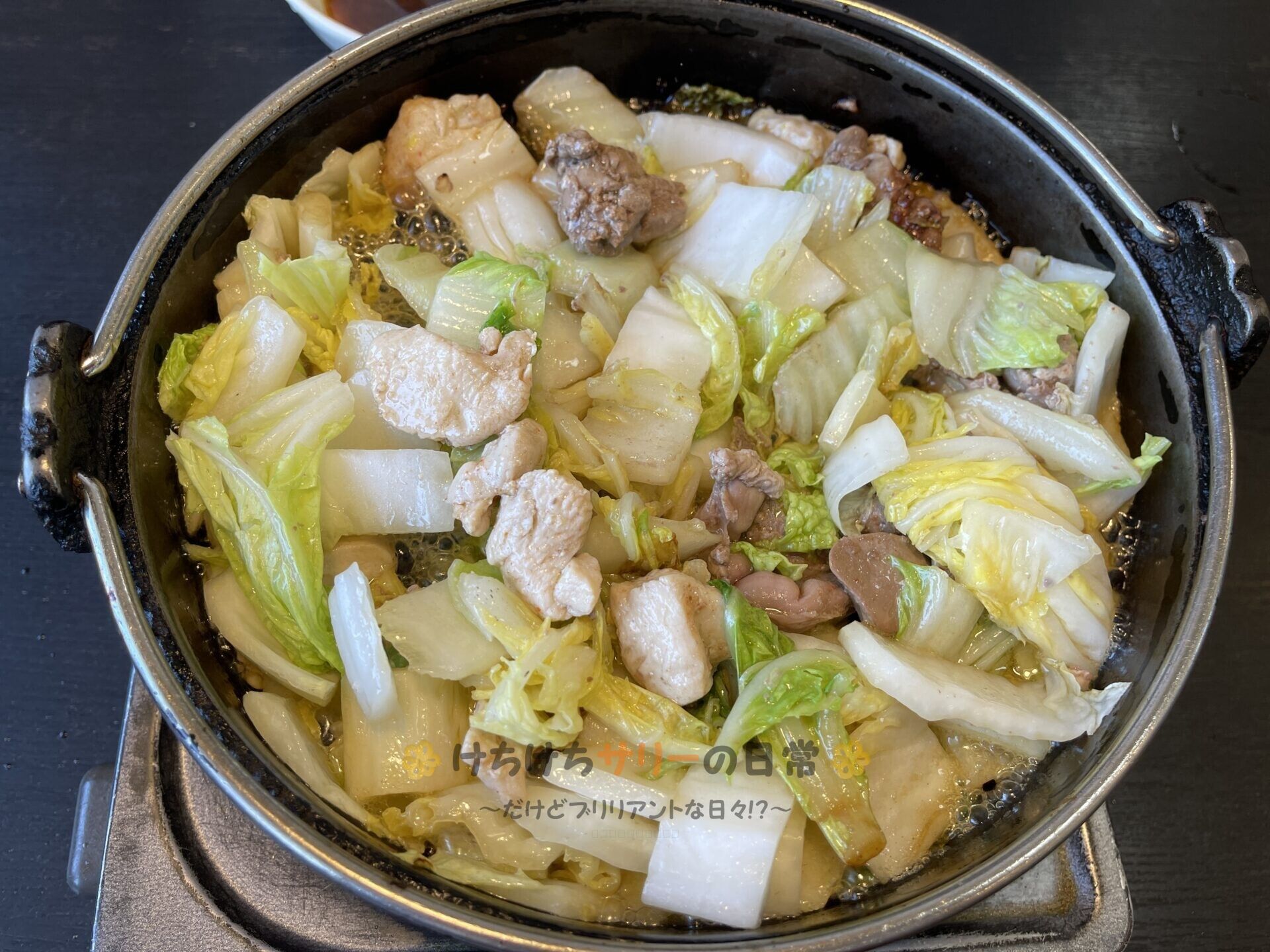 サリー達は悩んだ末に「ぢどり白菜鍋:700円」と「ぶた白菜鍋:680円」を注文。 運ばれて来た鍋には"ぢどり"と"ぶた"の両方が混ざって入ってたよ~🐓🐷