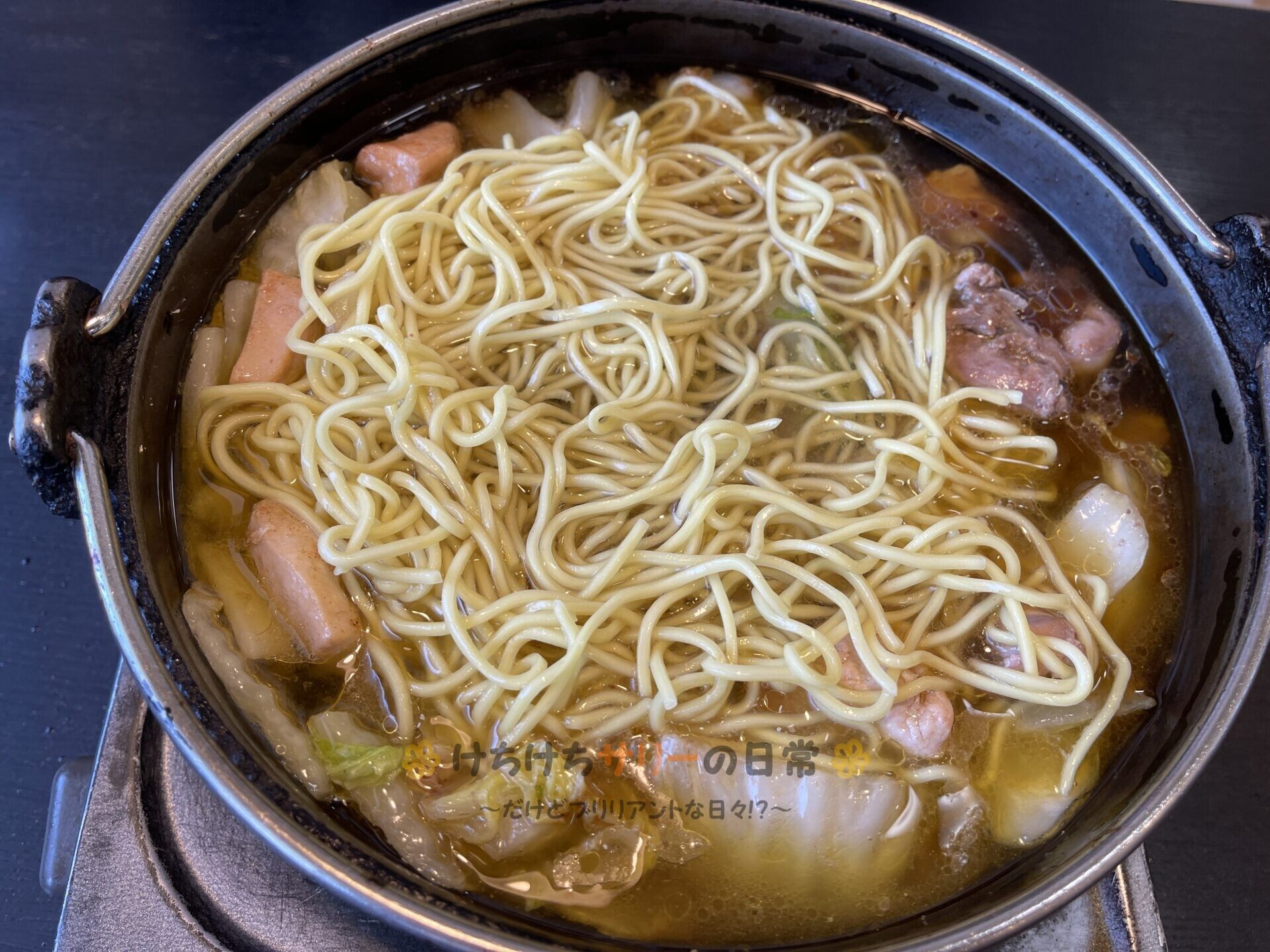 ラーメン用に具を残しておくと良いとお店の方が教えてくれたから、ラーメン玉と具を一緒に煮たよ。
