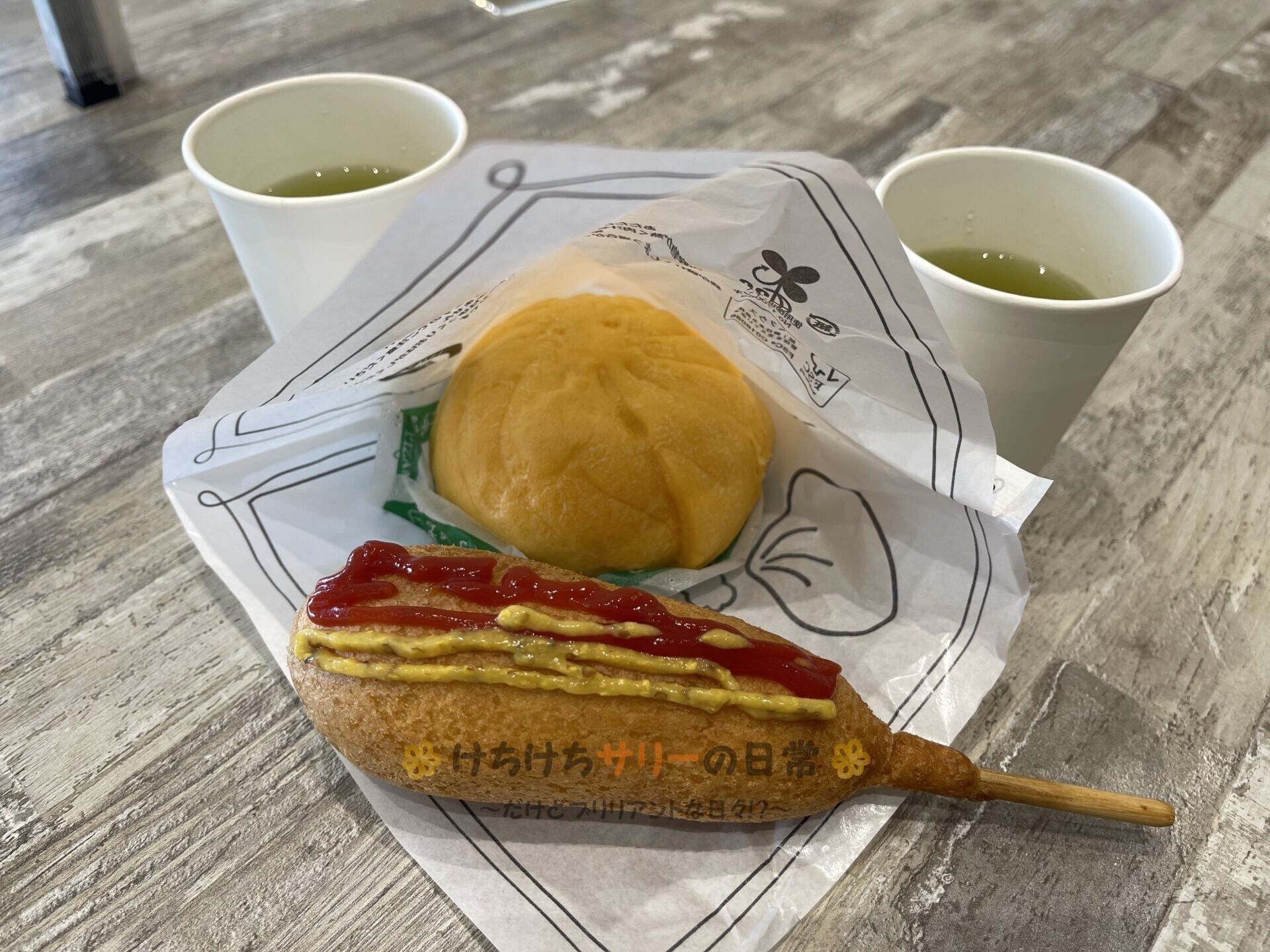 働いた後はおやつタイム!! 洗った道具が乾くのを待っている間にコンビニに出向いてサリーは「アメリカンドッグ:145円」、相方は「ピザまん:168円」を食べたよ。
