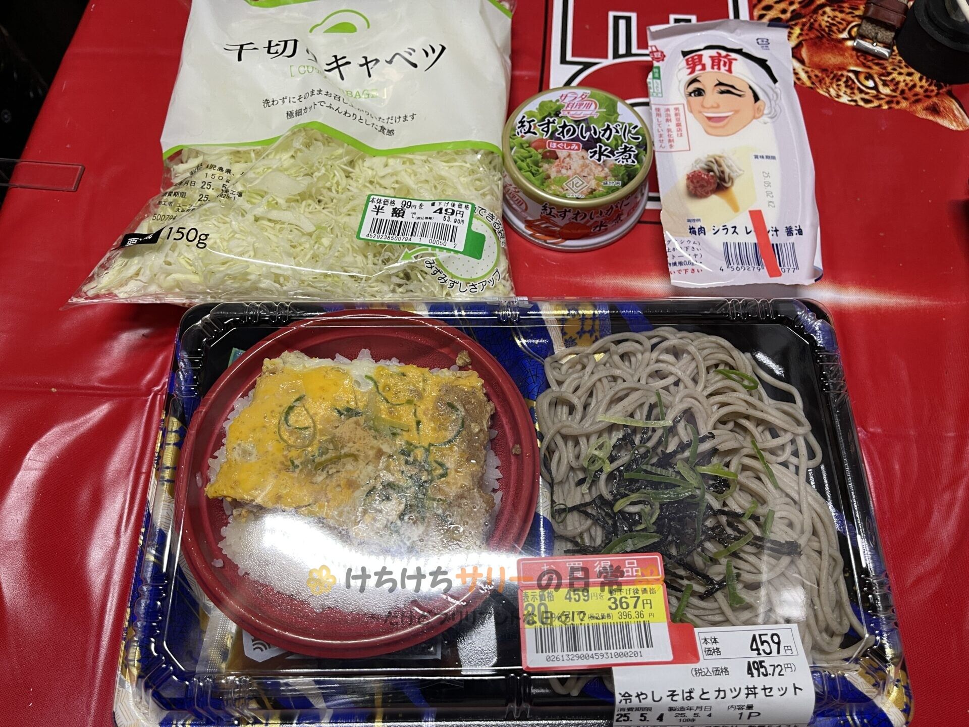 この日の夕ご飯は「冷やしそばとカツ丼セット:2割引きで396円」×2個、「冷奴」、「千切りキャベツ:半額で53円」、「紅ずわいがに水煮缶」だよ。