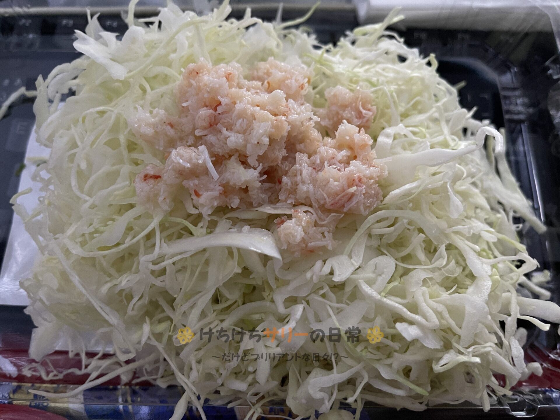 半額で買った「キャベツの千切り」に「紅ずわいがに水煮」を乗っけて高級サラダにして楽しんじゃった!