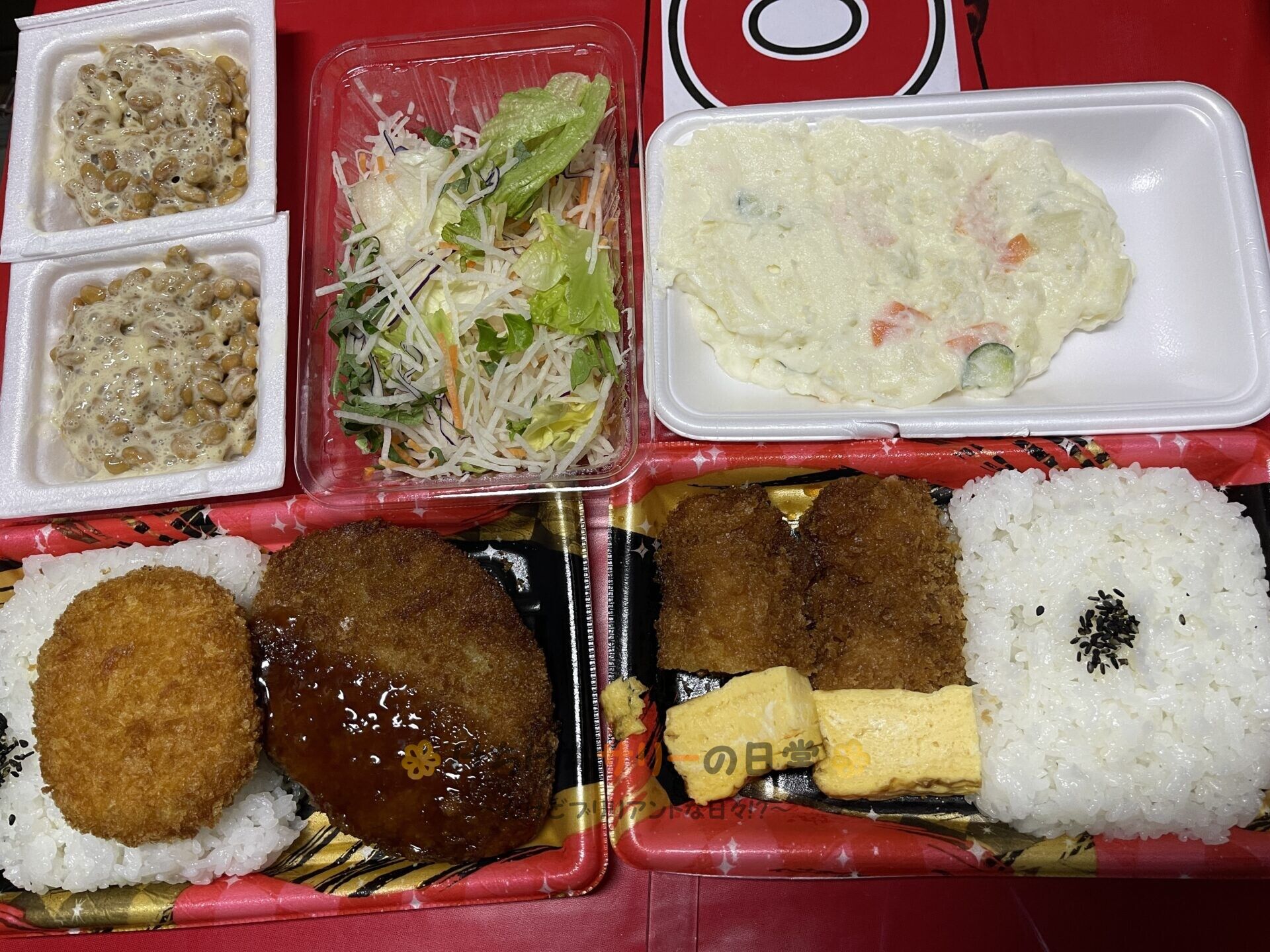 この日の夕ご飯は「イカフライ弁当:249円」、「メンチカツ&コロッケ弁当:249円」、「ポテトサラダ:20%引きで144円」、「大根サラダ:20%引きで80円」、「納豆」だよ。