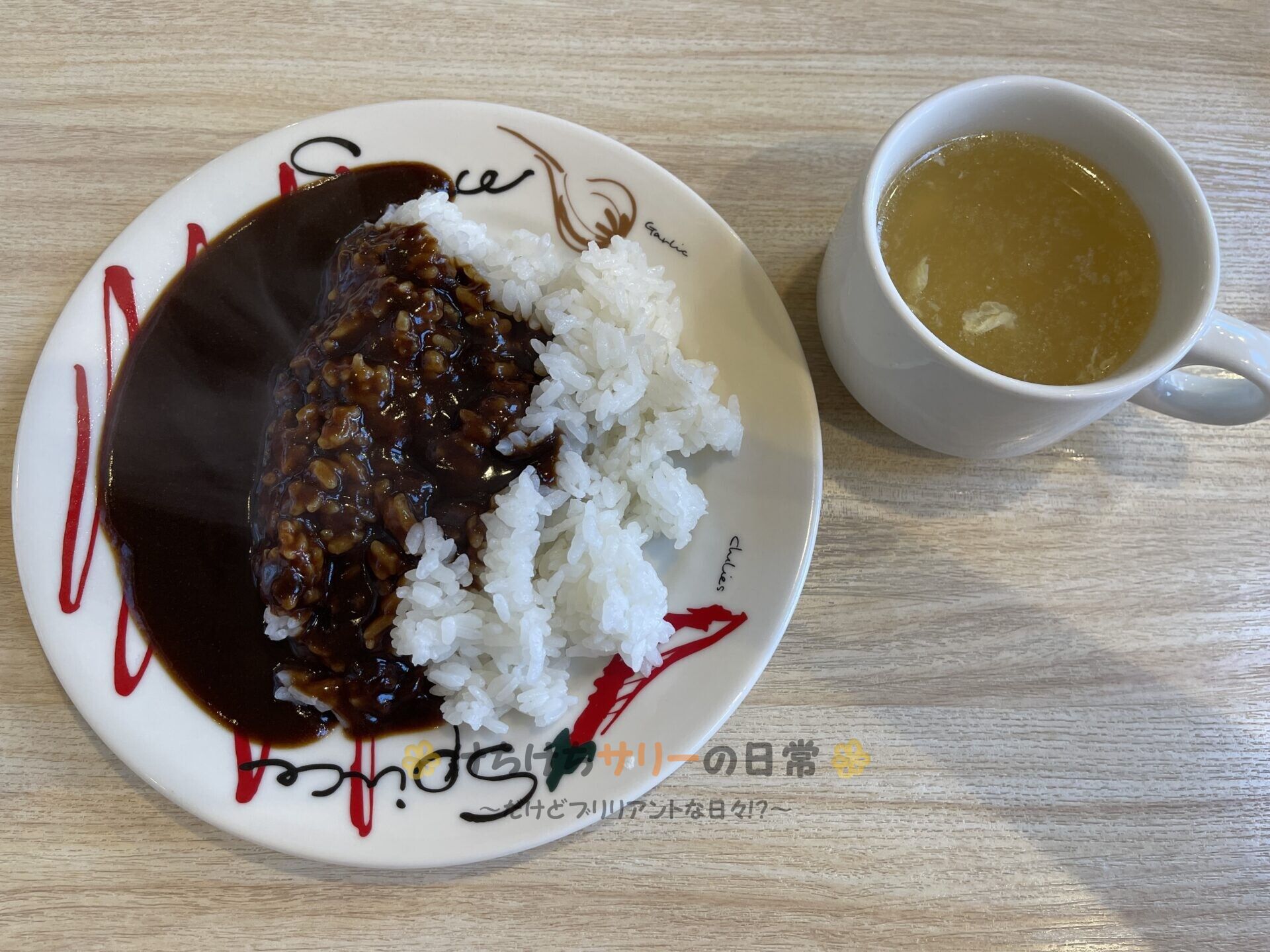 2人共、日替わりランチを注文👍 日替わりランチを頼んだ人はライス&黒カレー&スープが食べ放題だったから、メインが届く前に早速カレーとスープを取ってきたよ😆