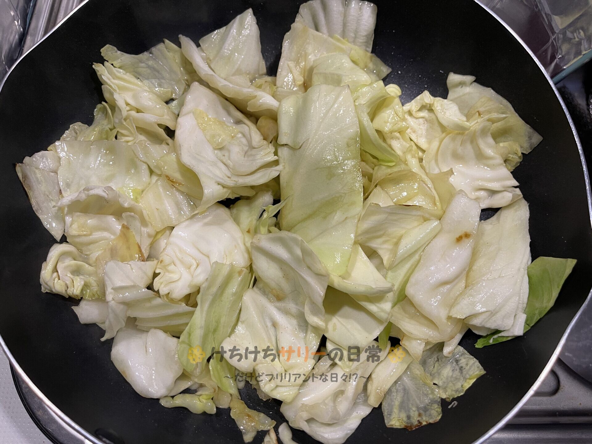 フライパンを洗わずに2種類の料理を作るから、まずは味が薄い方から作るね😉 最初に作ったのはキャベツのナンプラー炒め。 キャベツを切ったら塩とナンプラーで味付けするだけ。 簡単なのに驚くぐらい美味しいから大好きなの💖