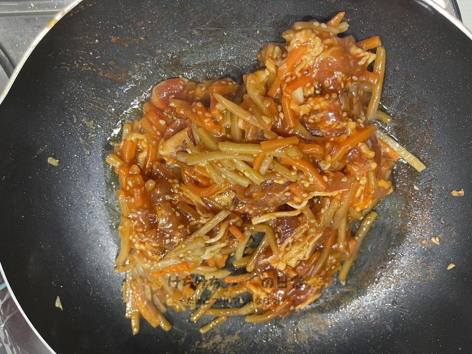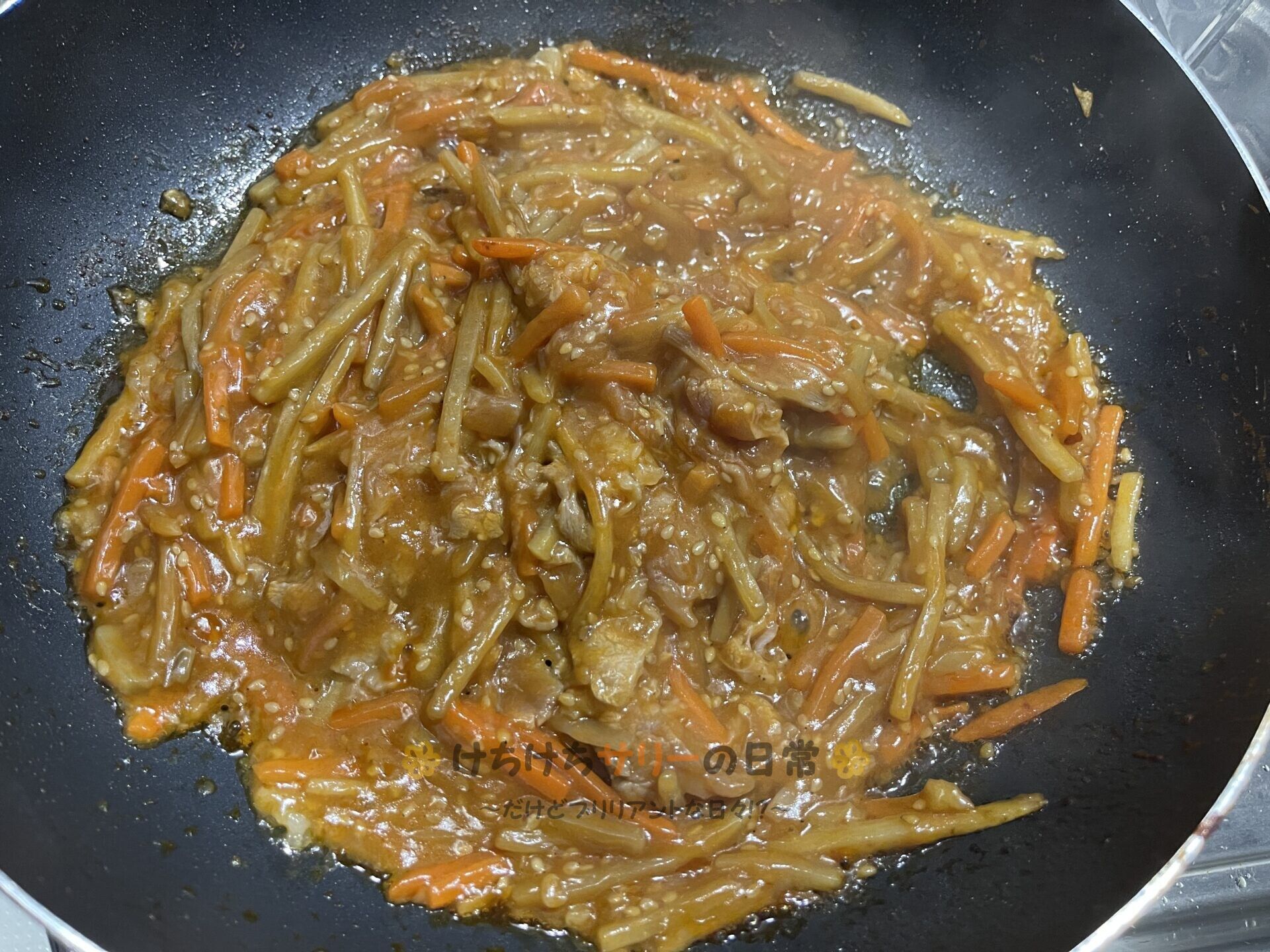続いては牛肉とごぼうのきんぴらを炒めて…