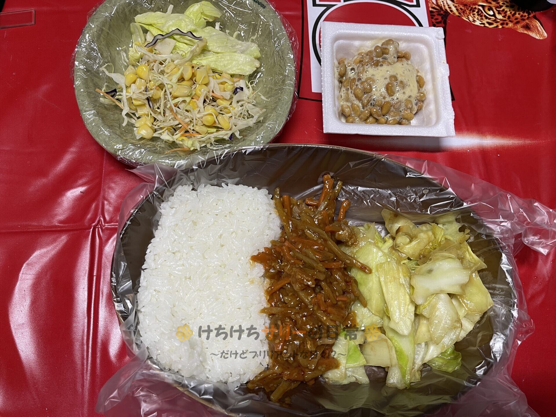 この日の夕ご飯は「ご飯」、「納豆」、「コーンサラダ」、「牛肉とごぼうのきんぴら炒め」、「キャベツのナンプラー炒め」だよ。