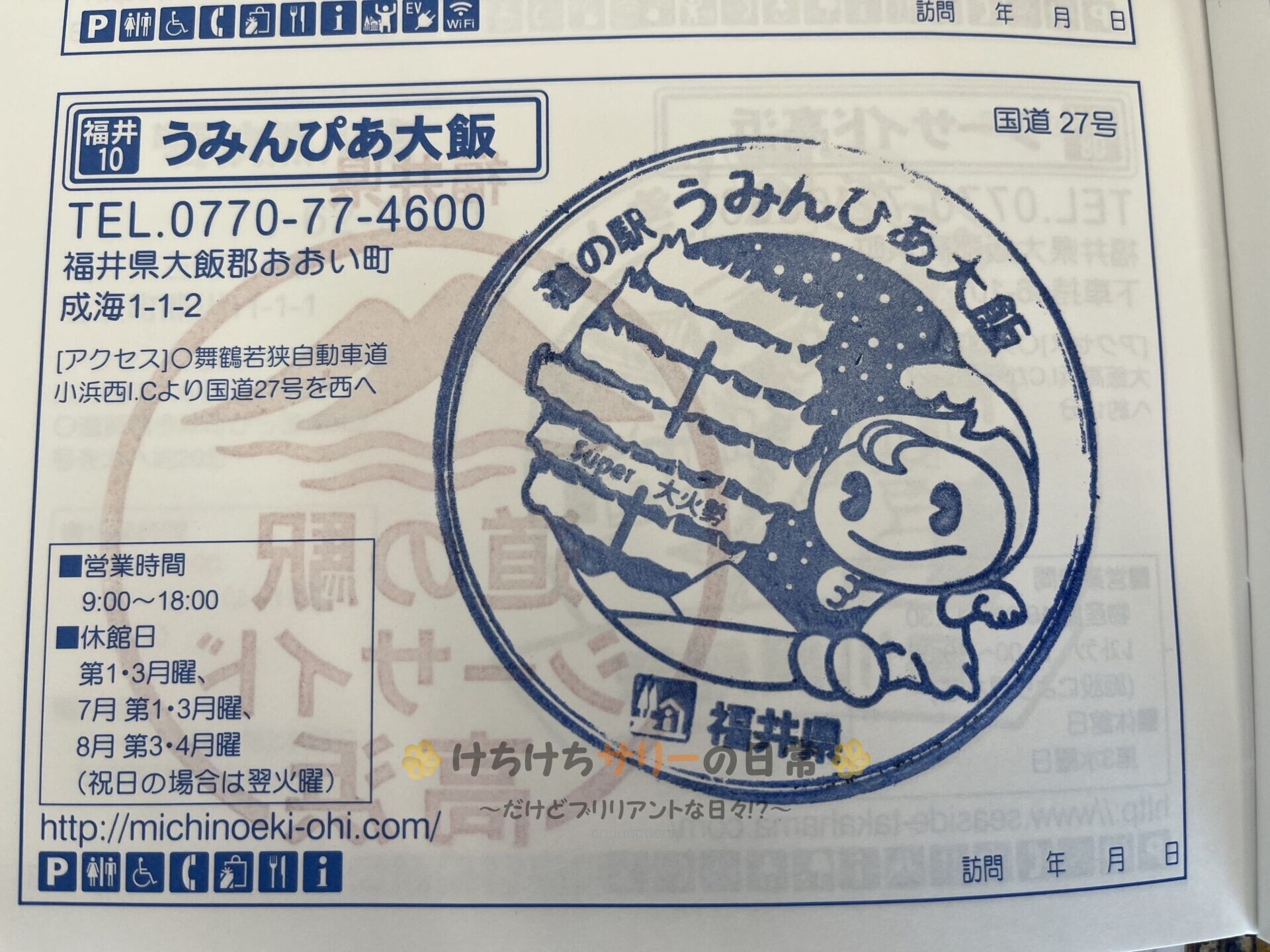 この日2個目のスタンプをゲット! スタンプのデザインは大飯町のマスコットキャラクター『うみりん』と大火勢。 大火勢(おおがせ)っていうのはこの町に伝わる火災鎮護と五穀豊穣を祈願する300年以上の歴史をもつ火祭りだよ。 毎年9月上旬に開催されるみたい。