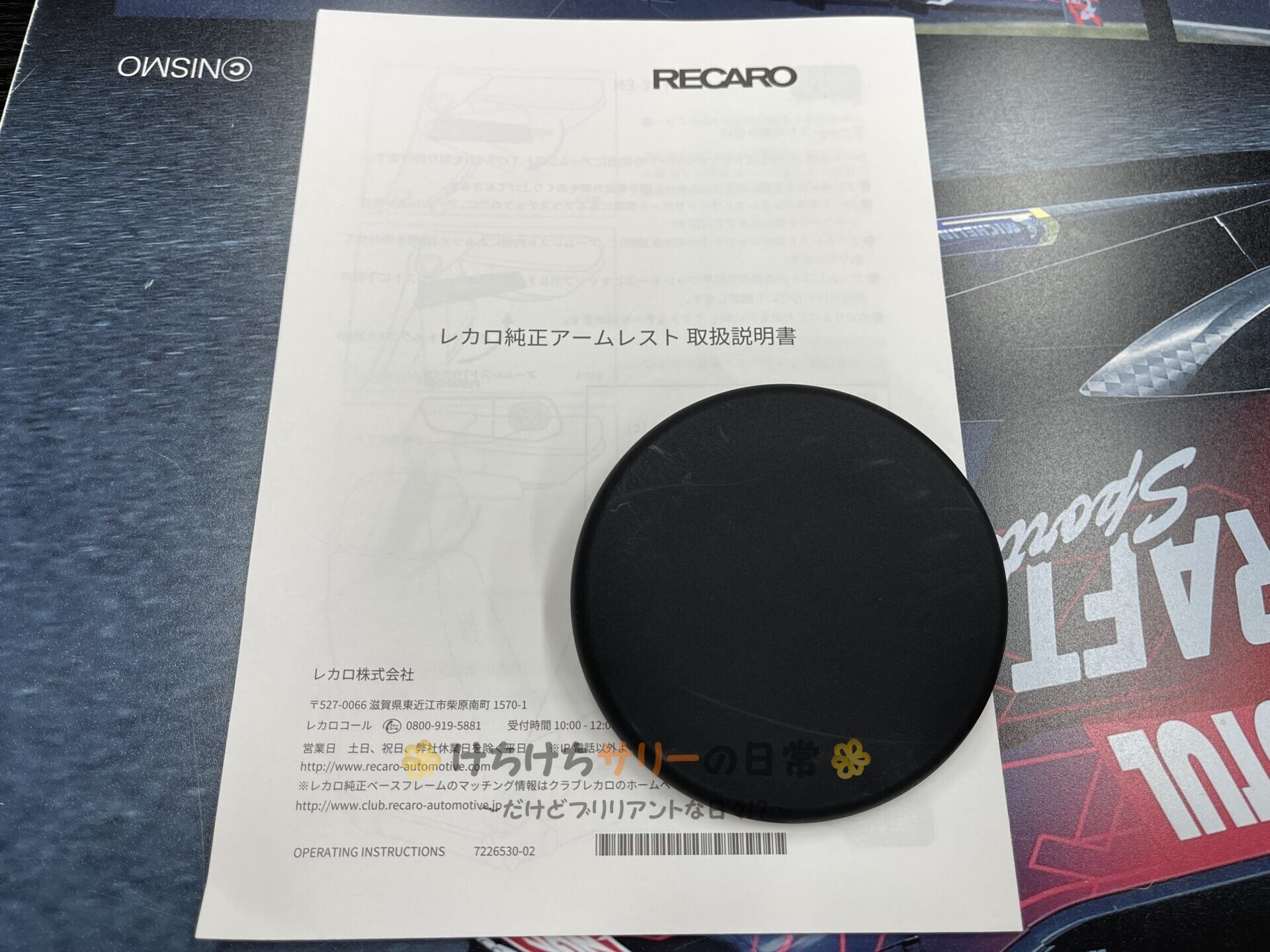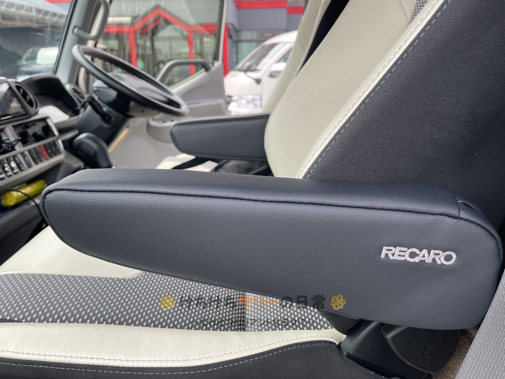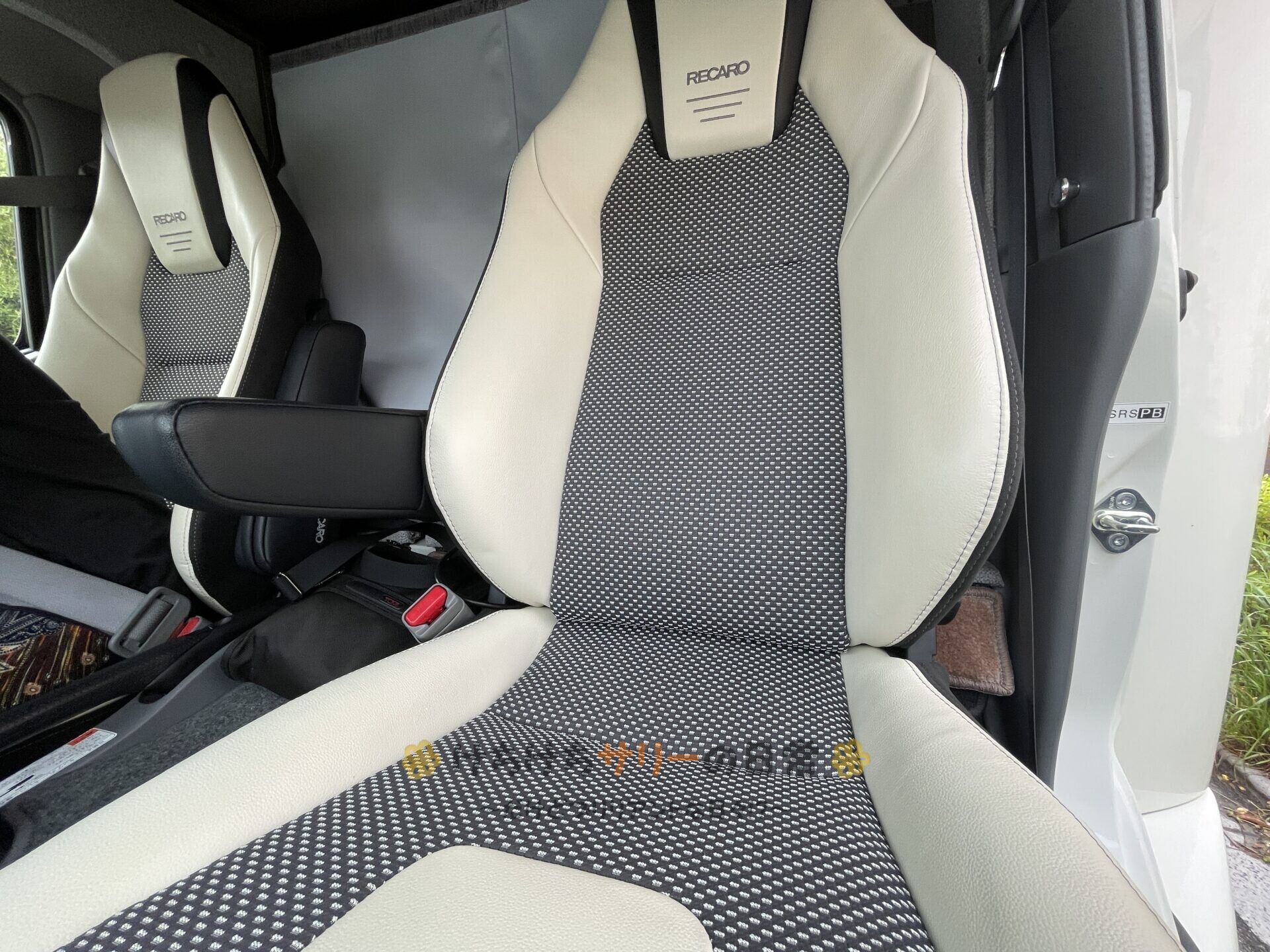 RECAROの刺繍が高級感あって良いね✨ ちなみに相方が座る運転席側は左腕側しかアームレストを付けて無いんだけど、仕様で右腕側には付けられない事になってるよ😔 サリーの方は両側にアームレストがあるから快適、快適✌