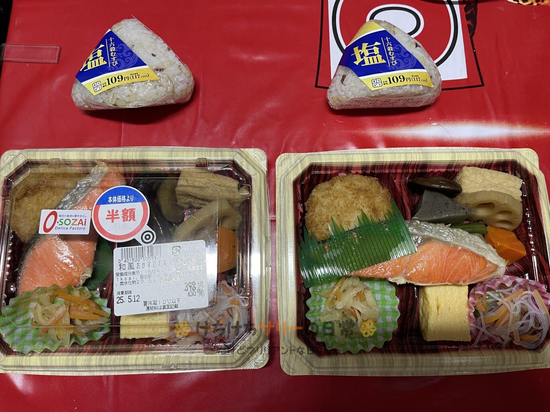 この日の夕ご飯は「和風おかずDELI:半額で215円」×2と「塩むすび:半額で58円」だよ。