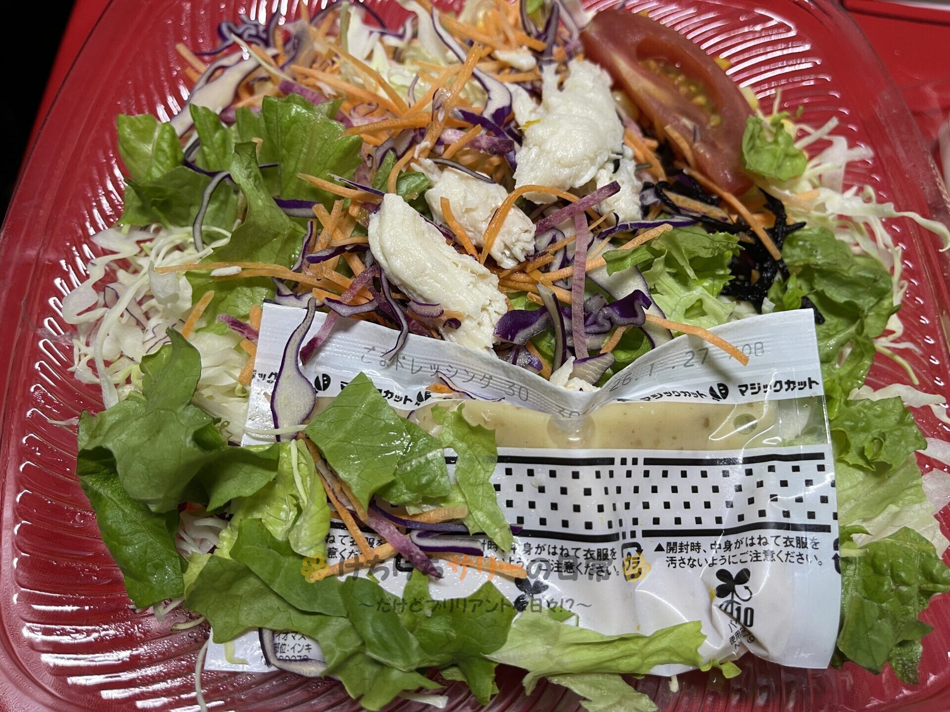 「1/2日分の野菜が摂れるバランスサラダ:半額で161円」も2人で仲良く食べたよ😉