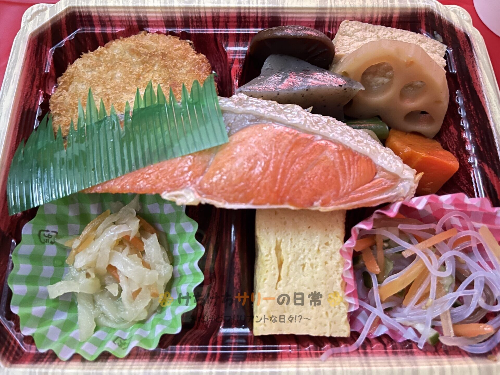 和中心で色々なおかずが入ってたよ~!! ご飯が付いてないから買おうか悩んだけど、おにぎりが半額で売ってて良かった🙂