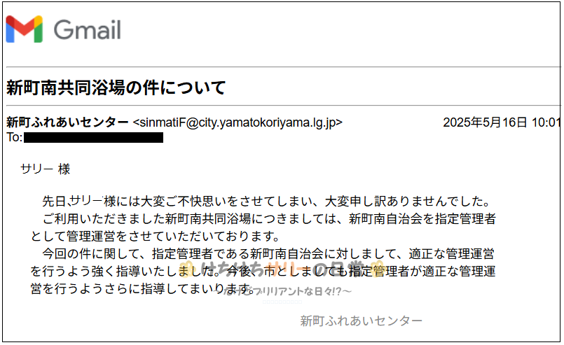 この入浴施設は市の管理だから、後日、役場宛にこのできごとを送ったらこんな返信が返って来たよ。