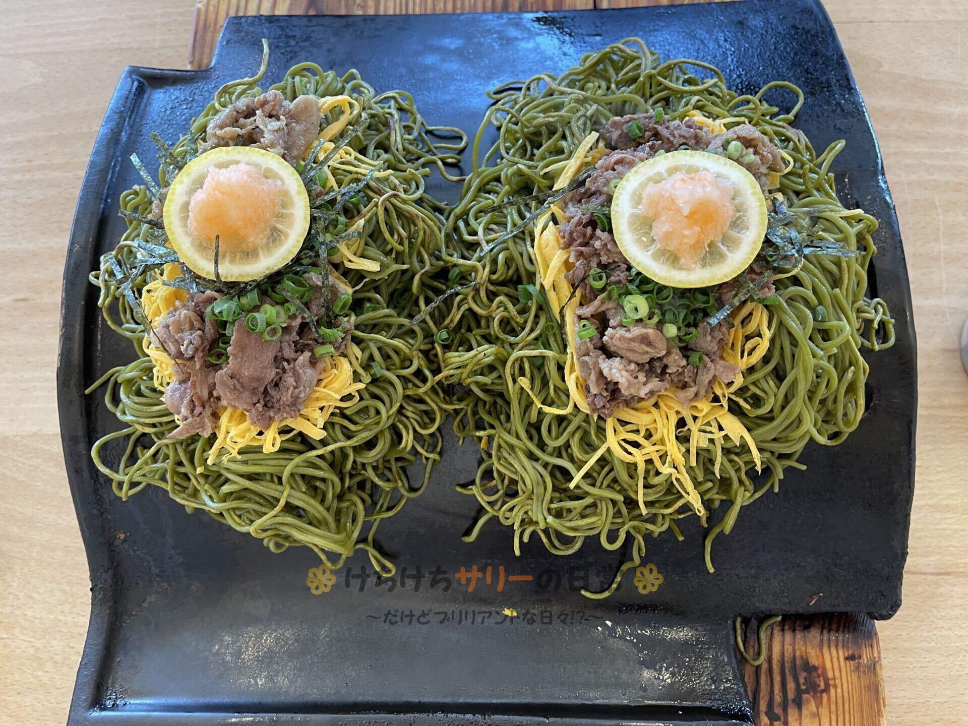 瓦そばっていうのは熱い瓦の上でパリパリ焼いた茶そばを温かいだしにつけて食べる料理で、麺の上に載っているレモンとか大根おろしをだしの中に入れて楽しむんだって📝