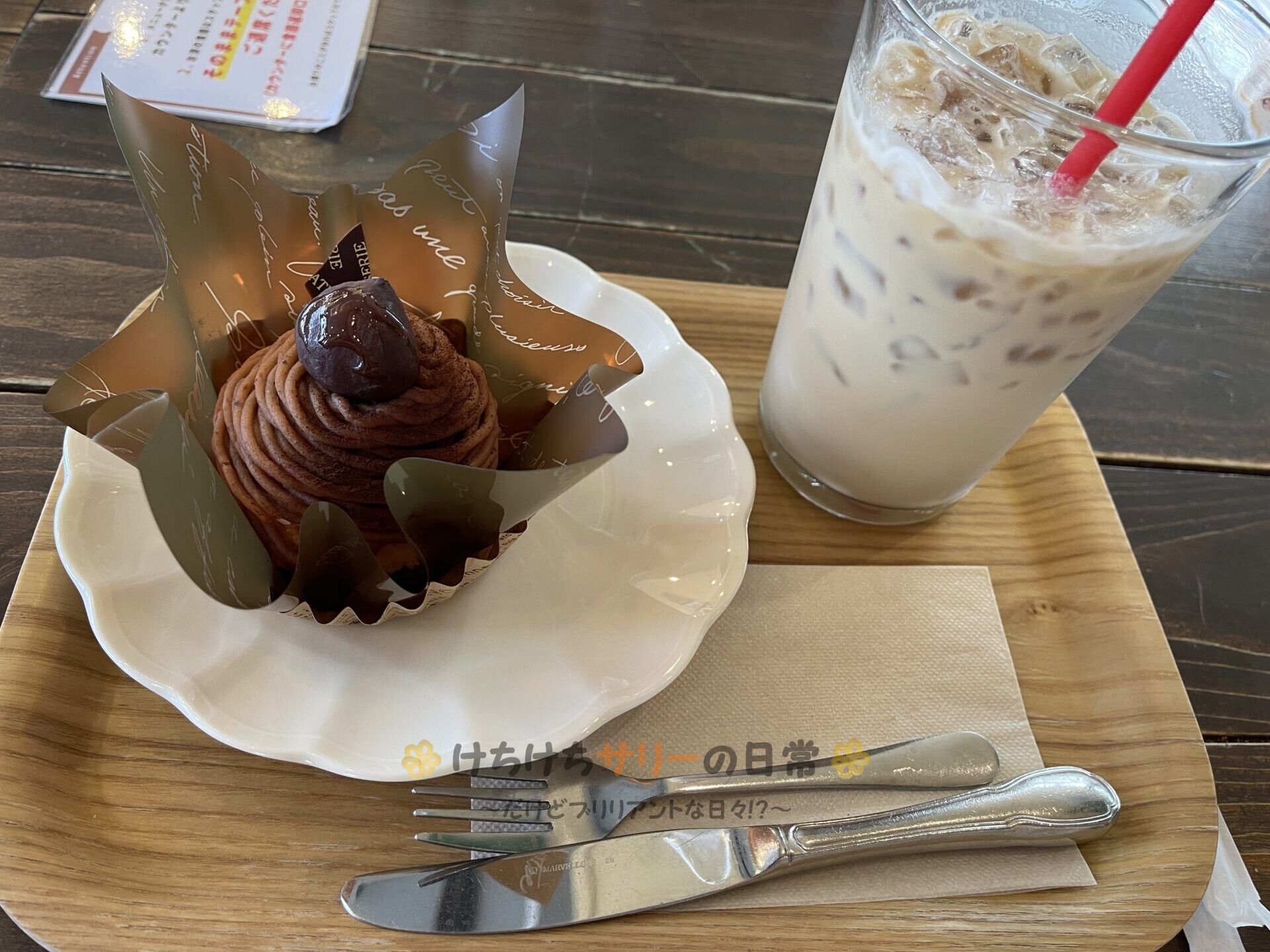 相方は「渋皮栗のモンブラン:528円」+「カフェラテアイス:440円」を注文。同じくセット割で110円引きになったから、写真のセットで954円だよ。