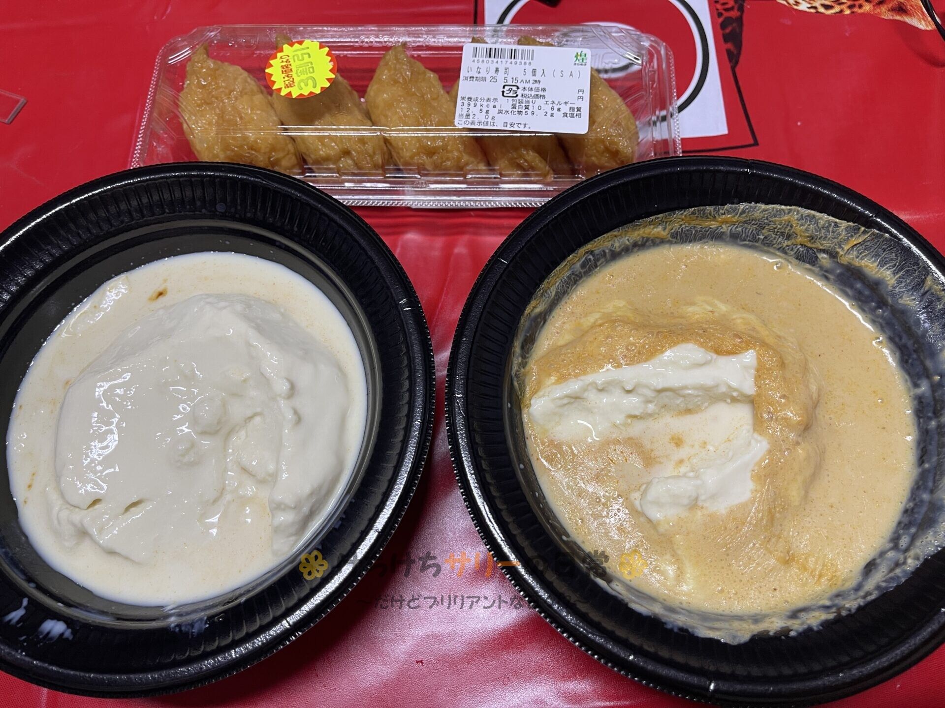 あとは、割引でゲットした「いなり寿司:3割引で90円」も一緒に食べるよ。