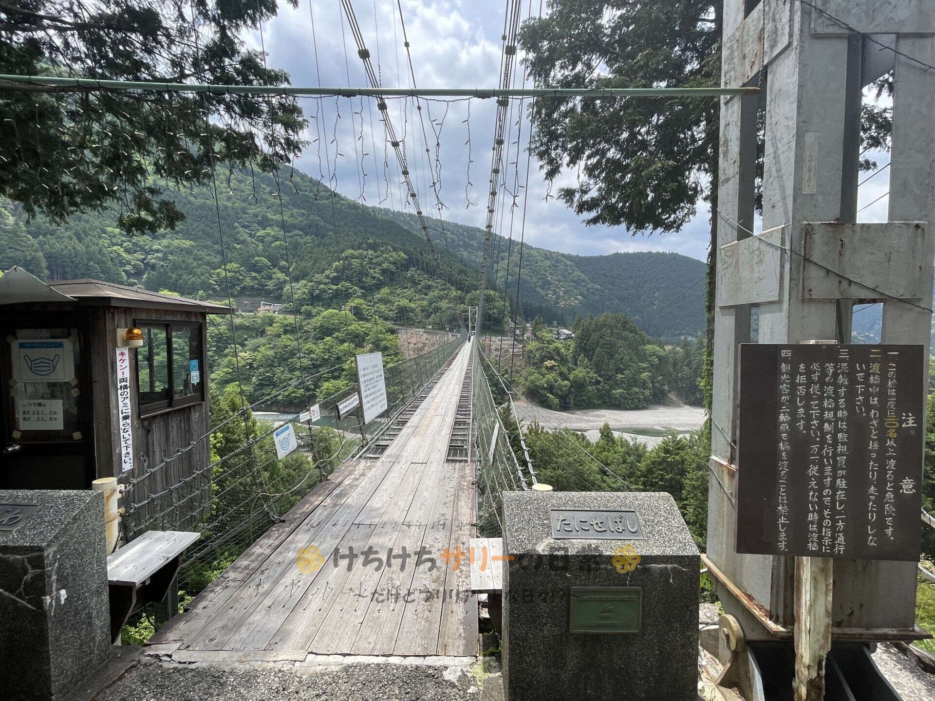 駐車料金はかかるけど吊り橋を渡るのは無料🆓 ちなみに1度に20人以上は渡れないって書かれてたけど数える人は誰もいなかった。 GWとか紅葉の季節の週末とかは小屋に人がいるのかな!?
