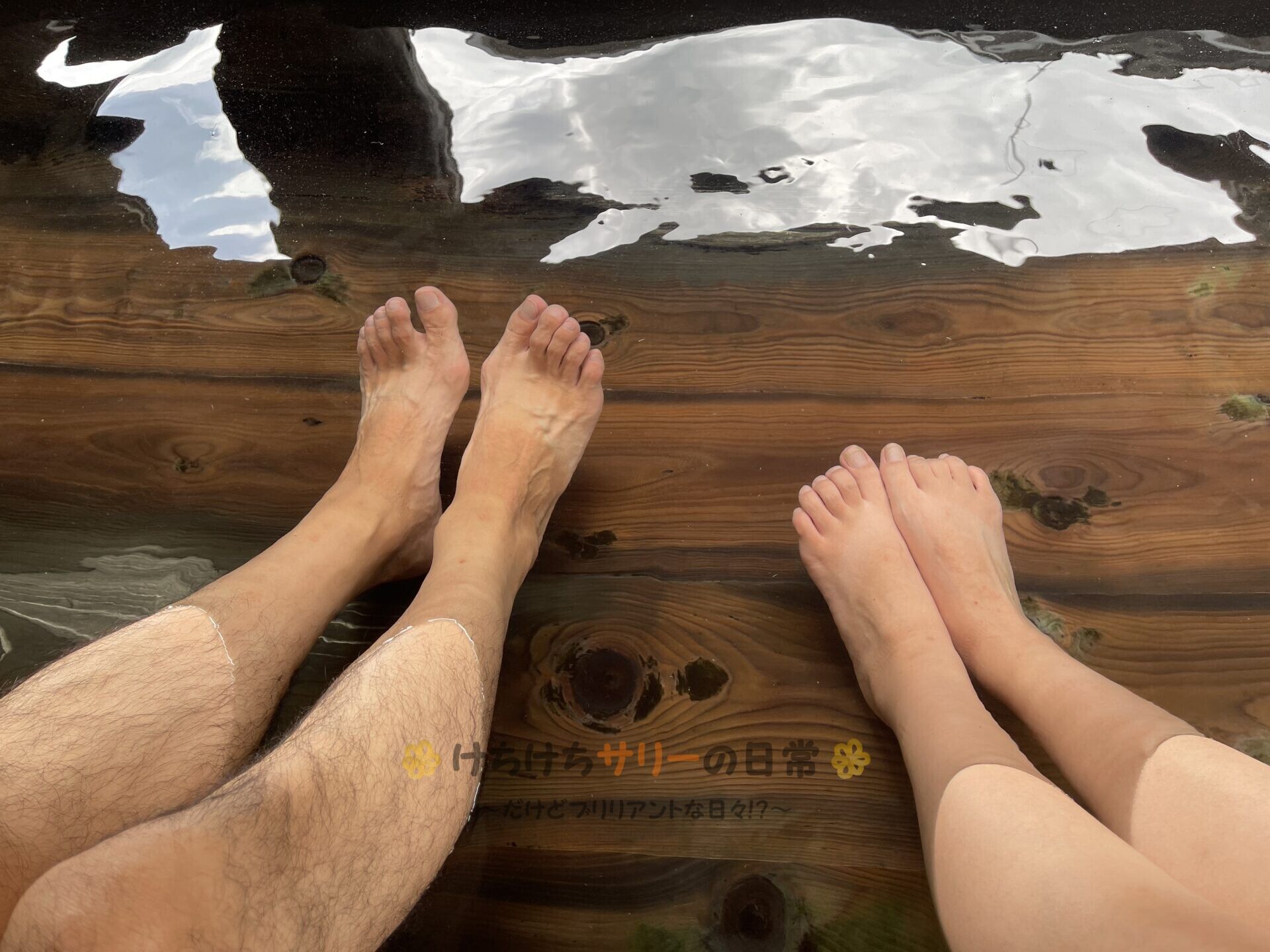 足湯を楽しみながら、前の日にお友達からもらった高級パンにハムとマヨをのっけておやつも楽しんだよ😋