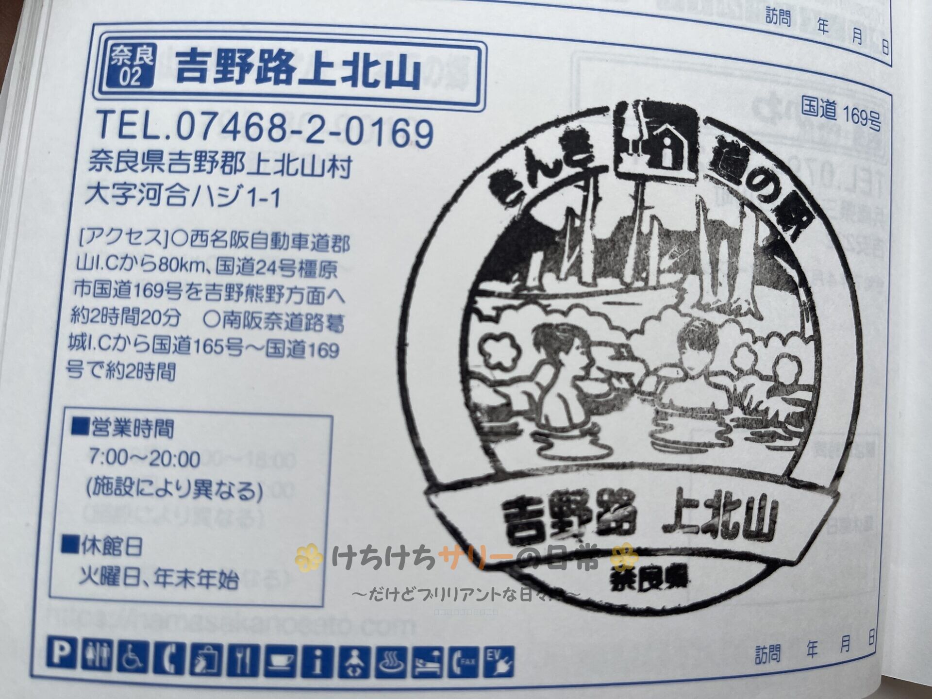 この日5個目のスタンプを押印! この辺りに重曹の効いた『上北山温泉 薬師湯』があるので、スタンプはその温泉のデザインだったよ。