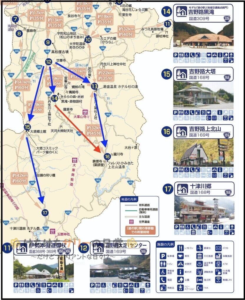 道の駅の方に道路の相談をしてみた所、⑭から⑯まで直接行く309号線で土砂崩れで通行止めがあったとの情報があった。でも今は通れるようになったかもとの事。