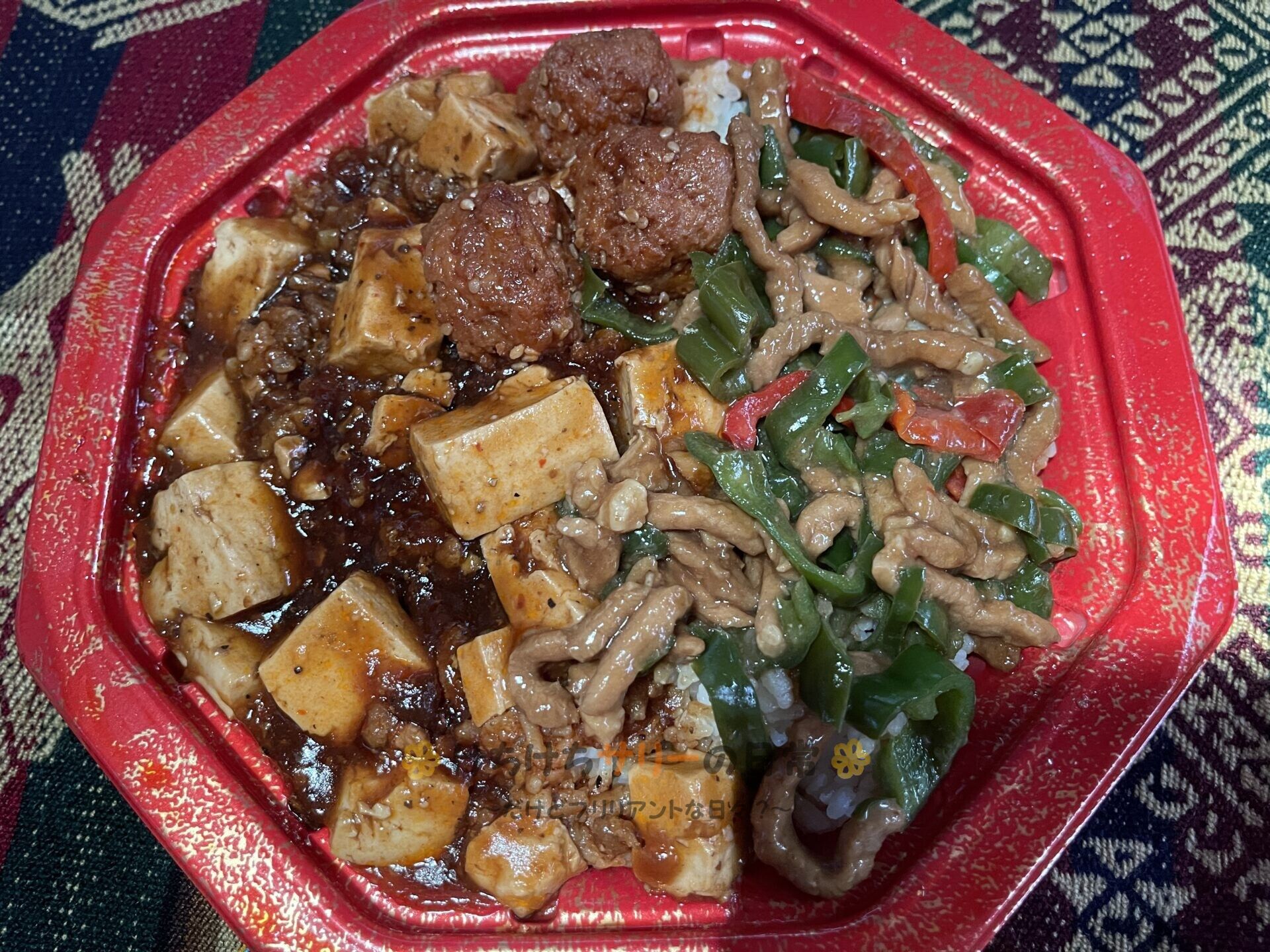 相方は「三種丼(青椒肉絲・麻婆豆腐・肉団子):30%オフで368円」を食べたよ。