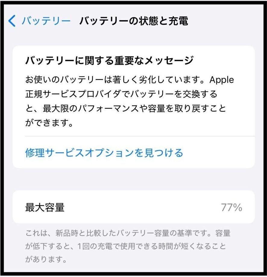 …というのも、サリーのiPhone12 Pro Maxは2020年12月19日に購入したもの。 4年半も使ったからバッテリーの最大容量(寿命の目安は80%以下)が77%になってて電池の減りが早いの🪫