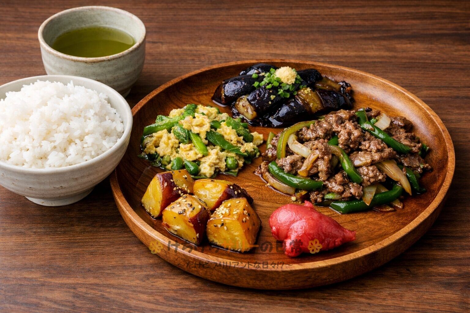 この日の夕ご飯は「ご飯」、「牛肉と玉ねぎとピーマンの炒め物」、「茄子の煮びたし」、「エンドウと玉子の炒め物」、「大学芋」、「サリーがお土産で買った梅味の生姜の漬物」だよ。