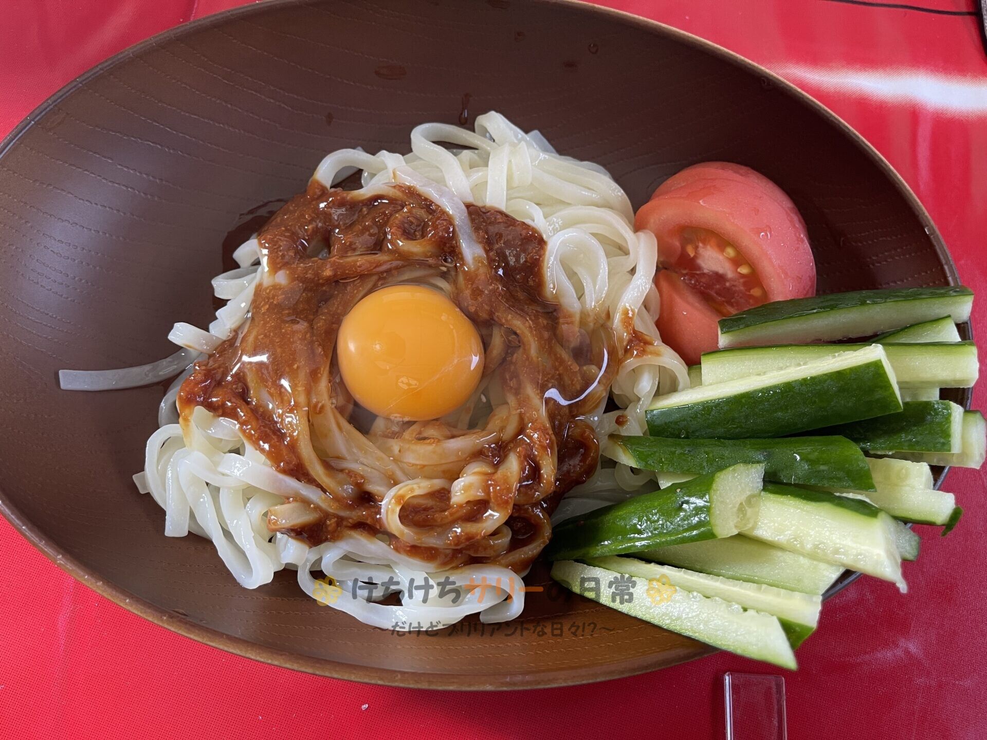 更に、冷蔵庫の中にあったキュウリやトマトも切ったら美味しそうな『じゃじゃ麺』が完成✨