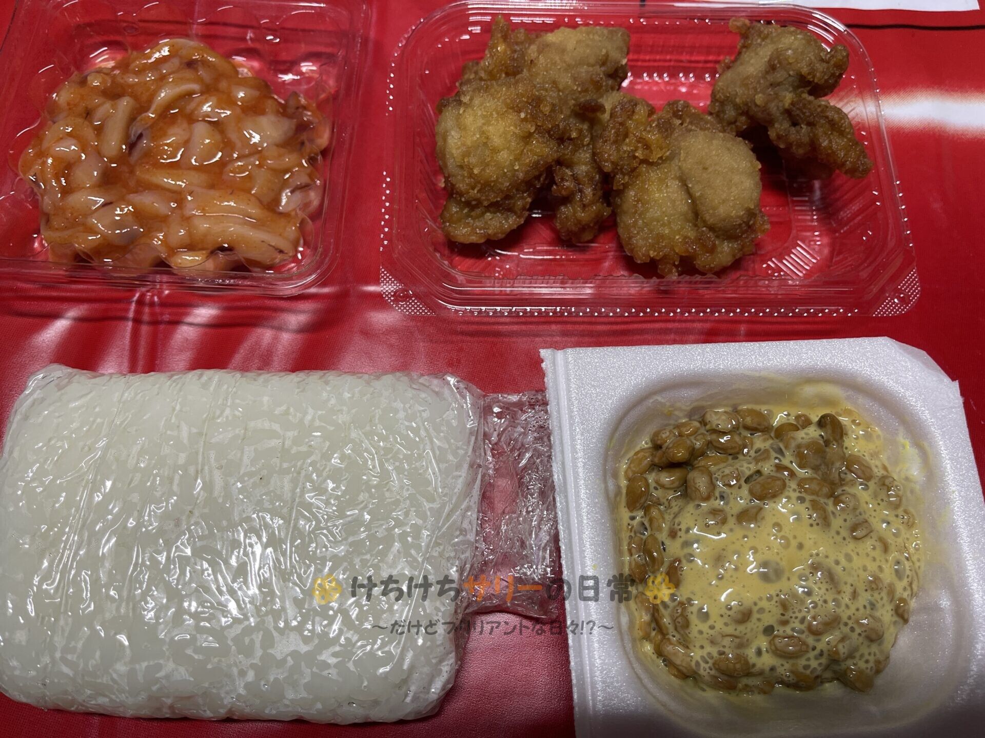 この日の夕ご飯は「サリーママから分けてもらったご飯」、「納豆」、「唐揚げのスズヒロ監修鶏もも唐揚げ:208円」、「いか明太子ぶっかけ:半額で173円」だよ。