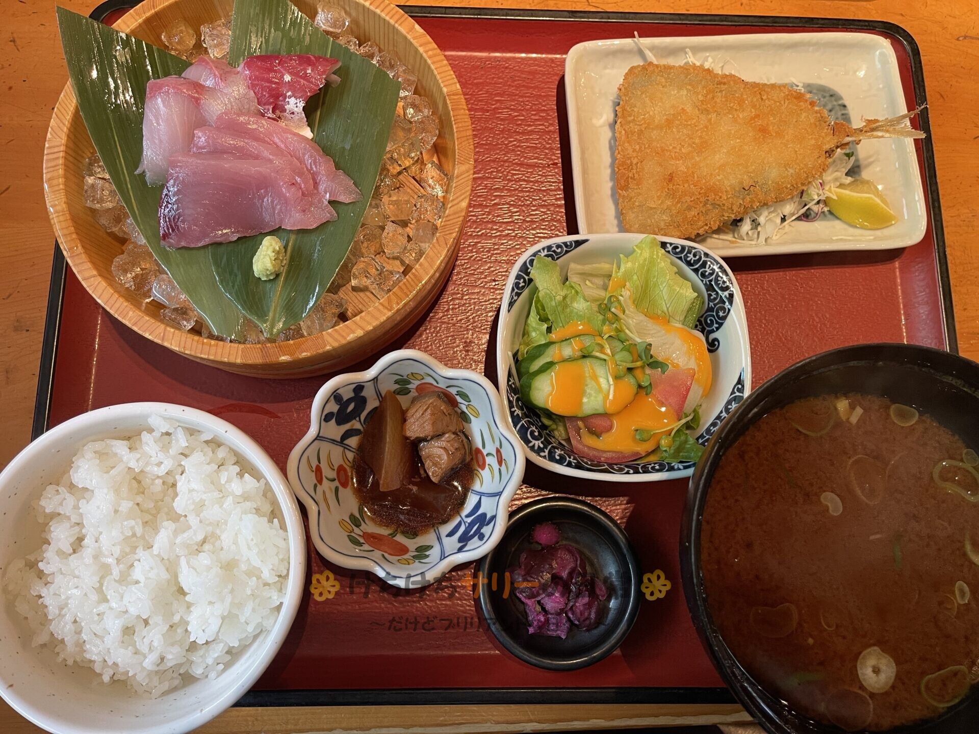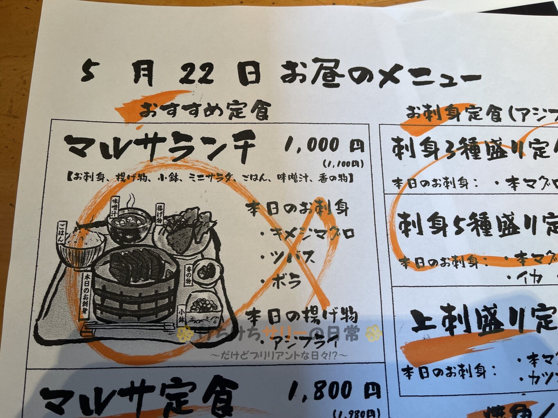 もちろん2人とも「マルサランチ:1,100円」にした👍 この日のお刺身は『キメジマグロ』『ツバス』『ボラ』。聞いたことがない魚ばっかりだけど、どれも新鮮で美味し~🤤
