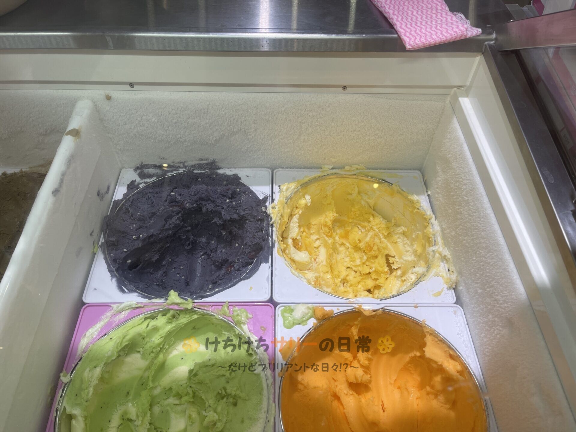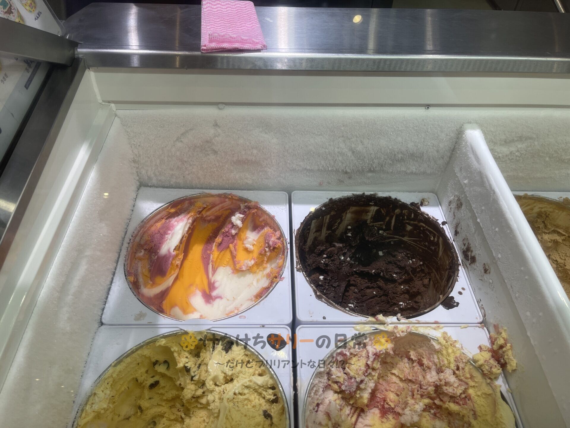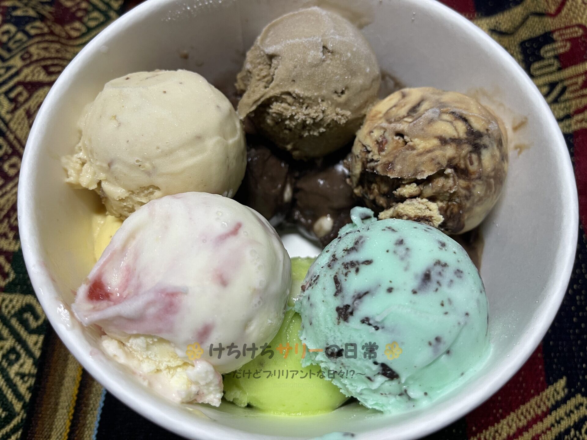 写真右上の茶色い『ロッキーロード』っていうアイスクリームが1番好き💖 チョコレートアイスにアーモンドとマシュマロが入ってるんだけど、サリーは好きすぎて5個のうち2個をロッキーロードにしたよ。 ちなみに相方も1個頼んだから10個のうち3個がロッキーロード🍨