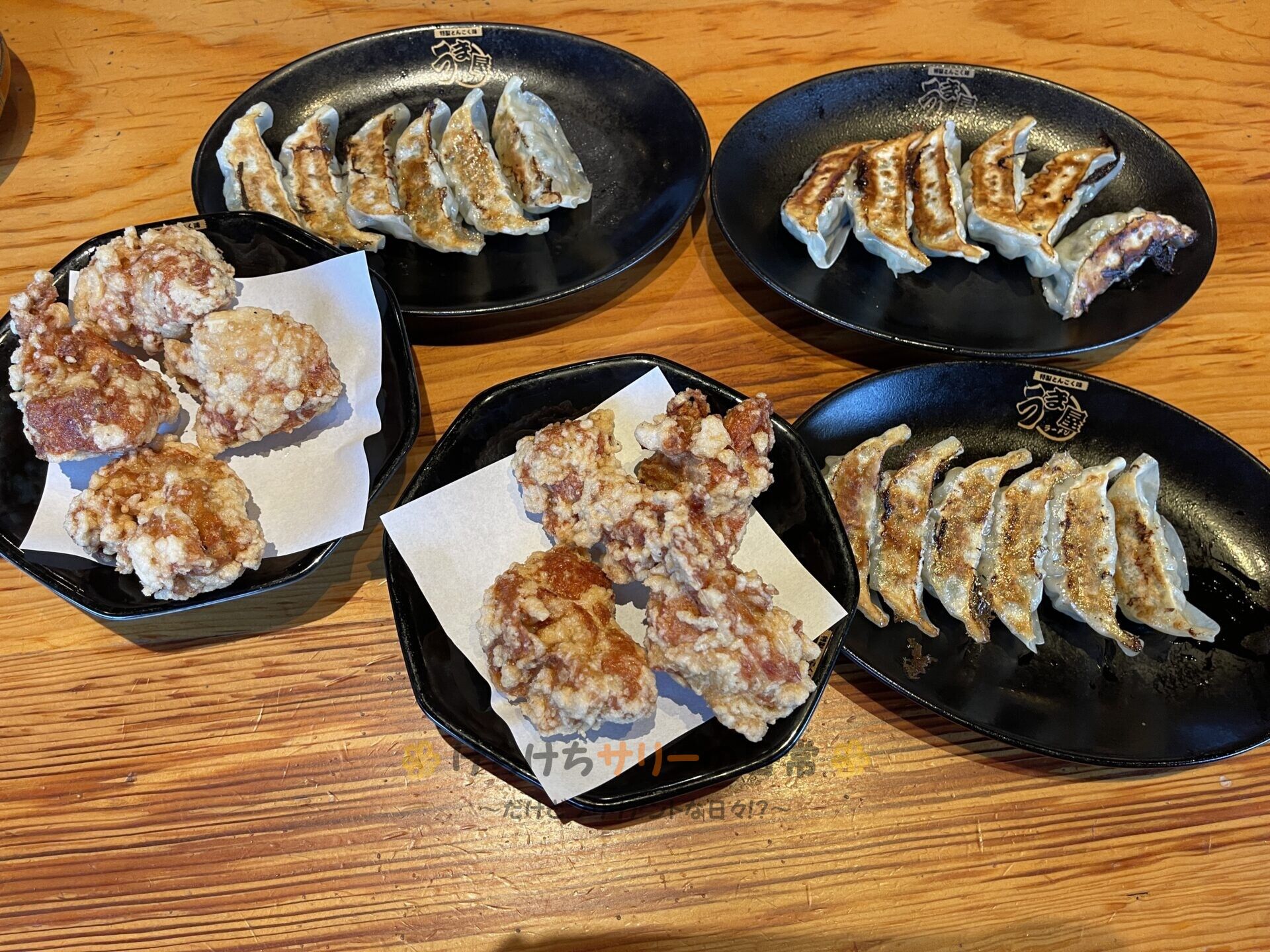 「餃子:420円」が3皿に「から揚げ:520円」が2皿と机の上は既にパーティー状態🥳