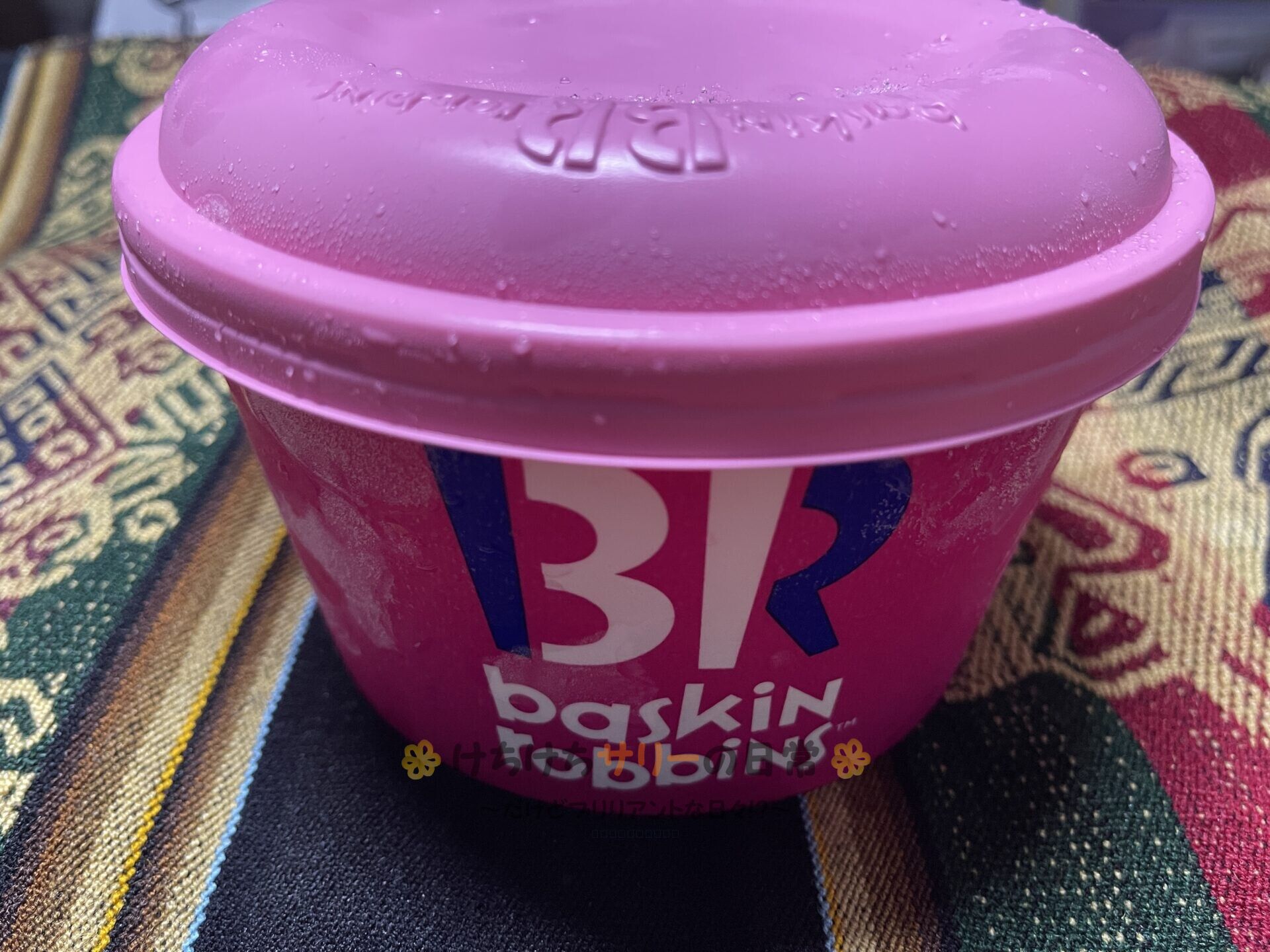 受け取ったアイスは特大のカップに入れて蓋が閉まった状態で渡されるよ。