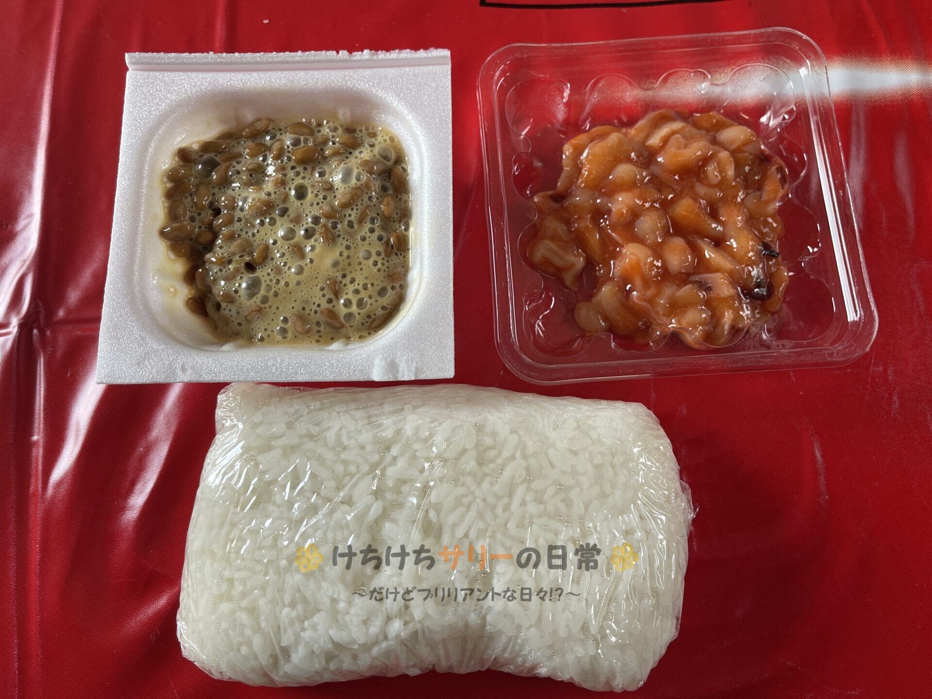 この日のお昼ご飯は「サリーママからもらったご飯」、「納豆」、「イカ明太」だよ。