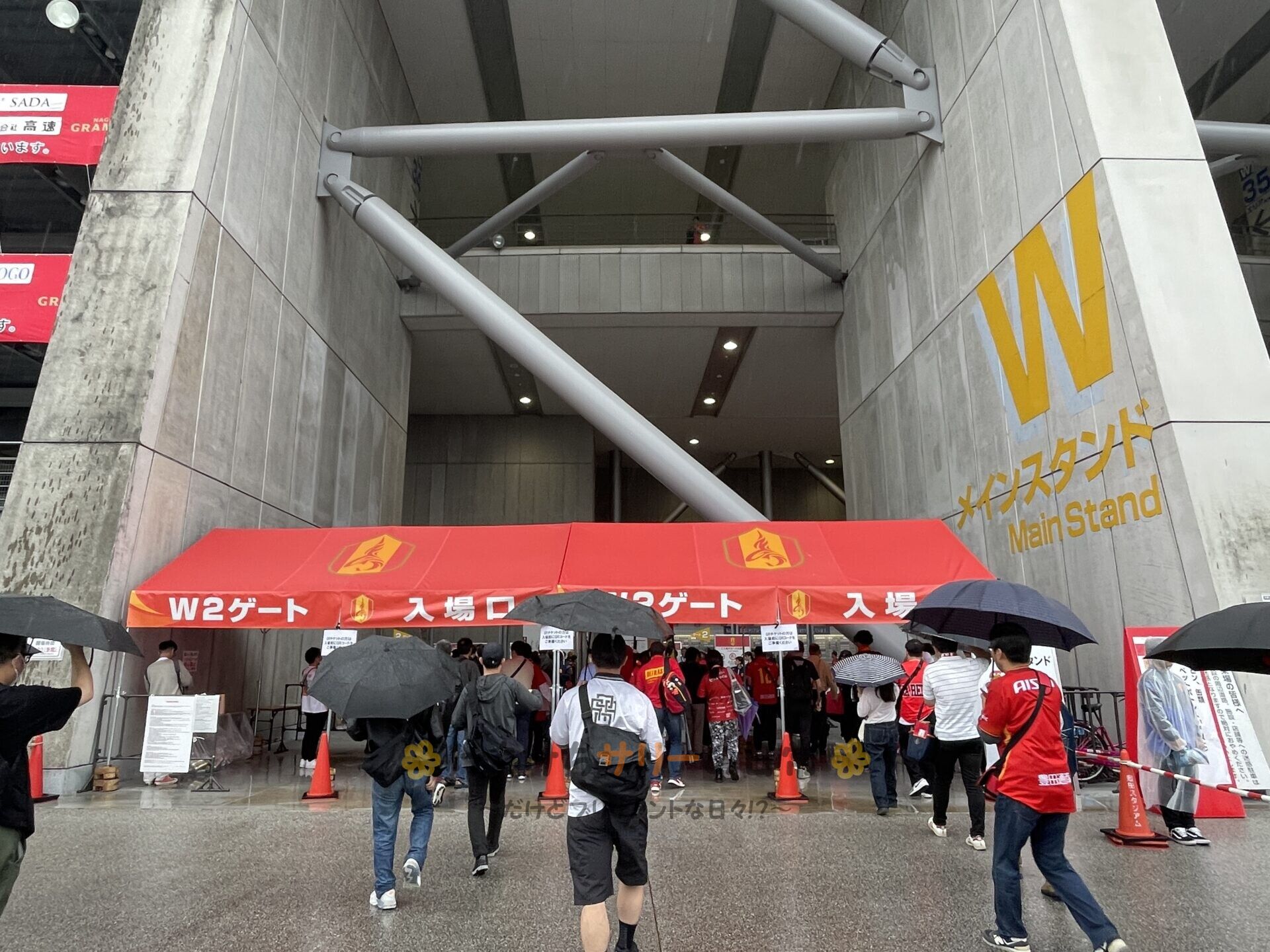 浦和の選手が練習前に応援団席に挨拶に来た所は動画に収めたから見てみてね👇 応援団席は屋根が無いから雨で濡れちゃうけど、雨が降ってても大旗を振って選手を鼓舞する応援団には頭が下がるね。