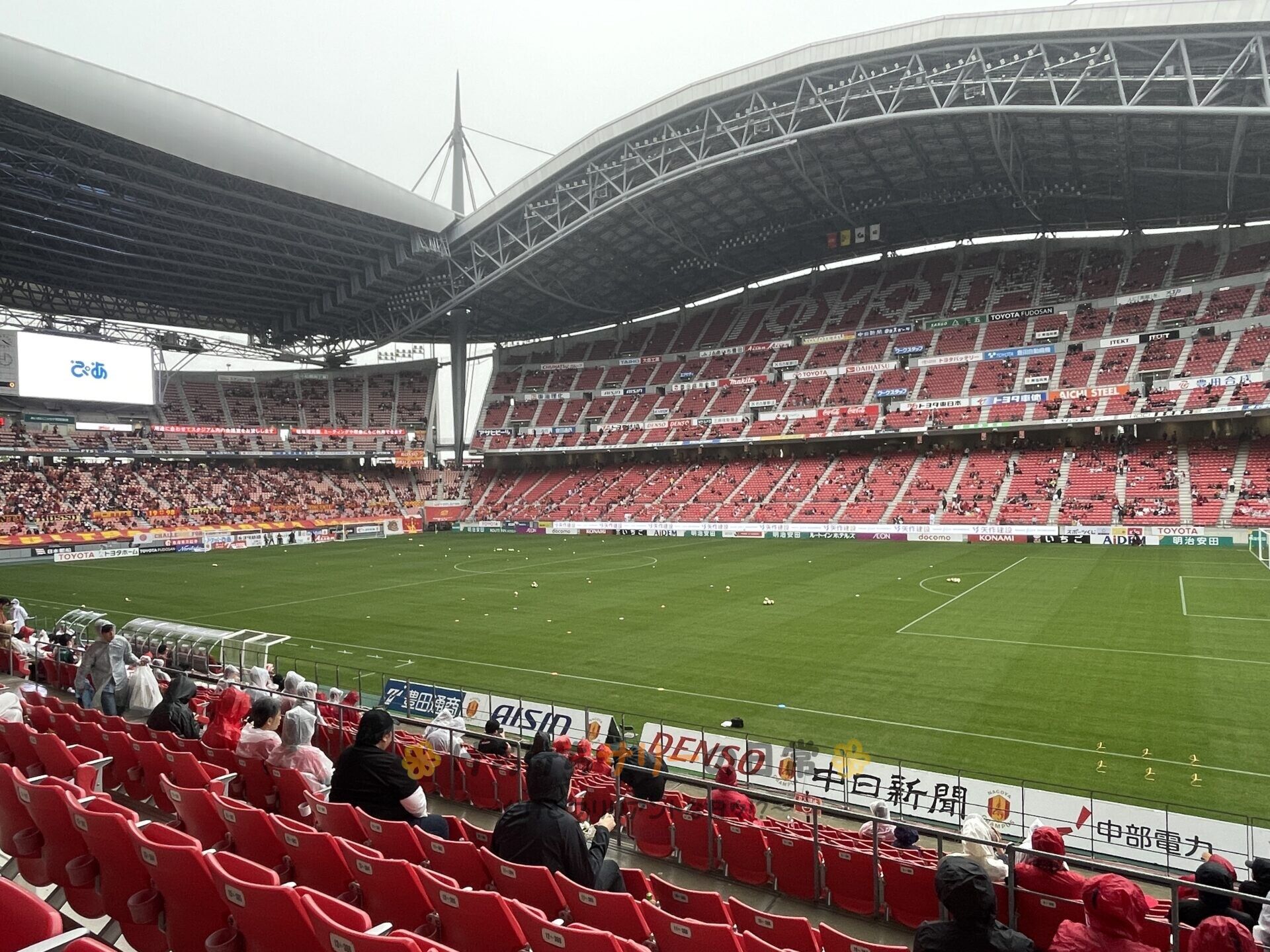 雨が降ってるのが残念だけど、サリー達の席は屋根があるから観戦中は濡れないはず✌ いや、選手は雨の中で頑張るんだから例え濡れてもマイペンライ👍