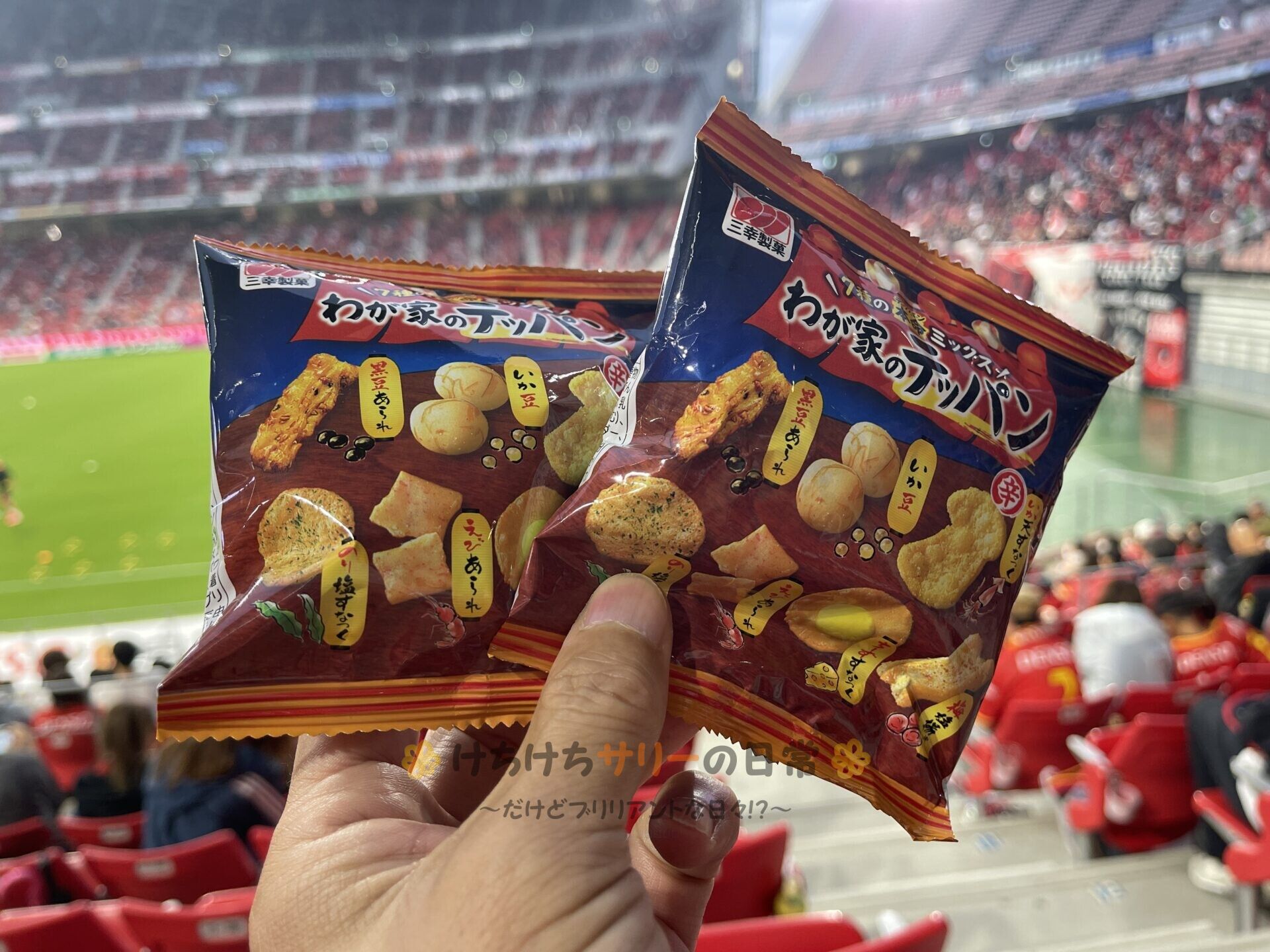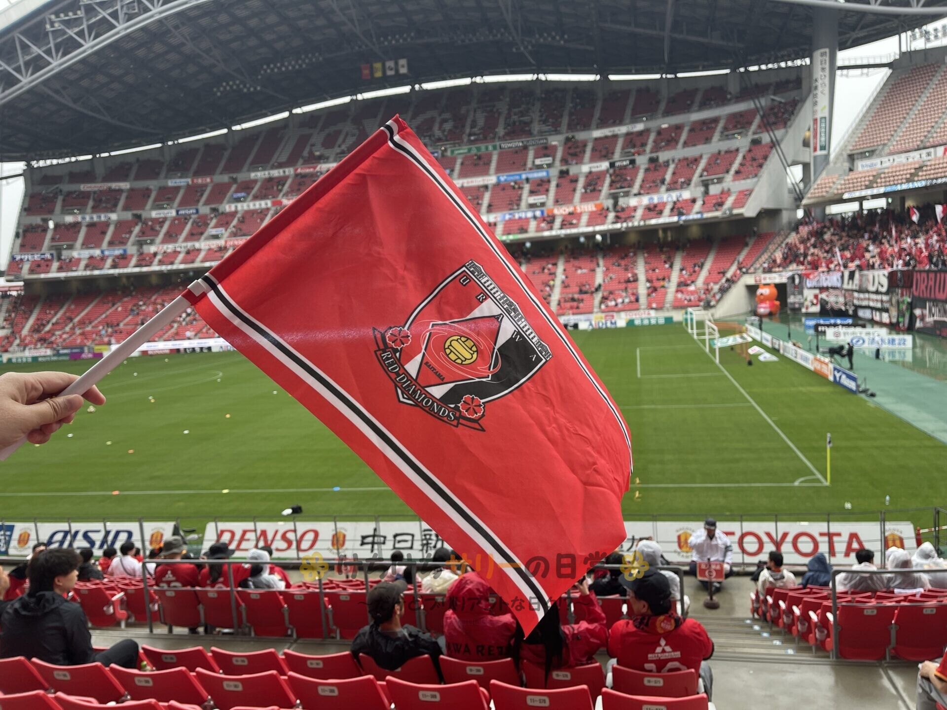 ここのエリアは名古屋グランパスサポーターと浦和レッズサポーターのどっちも入れる席種なので、サリー達は浦和レッズの旗を振って応援するよ📢