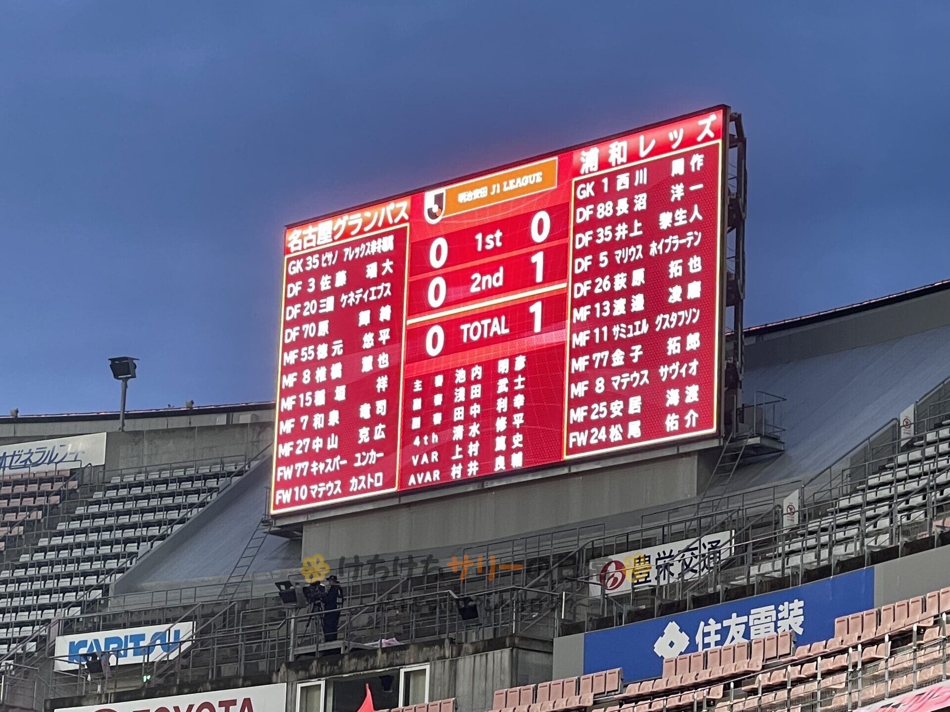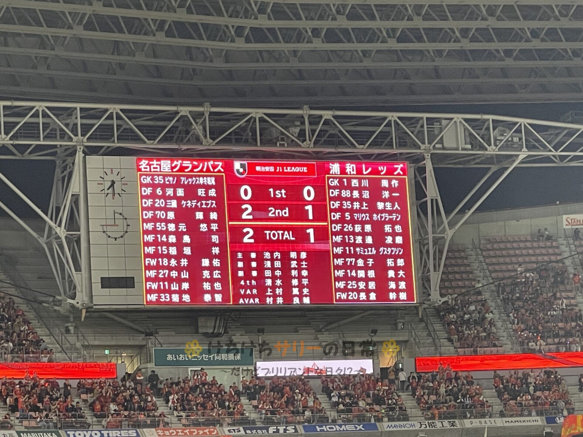 までは良かったんだけど、その後、名古屋グランパスに2点取られて逆転された😭 この日の試合は2対1で敗れたよ💀