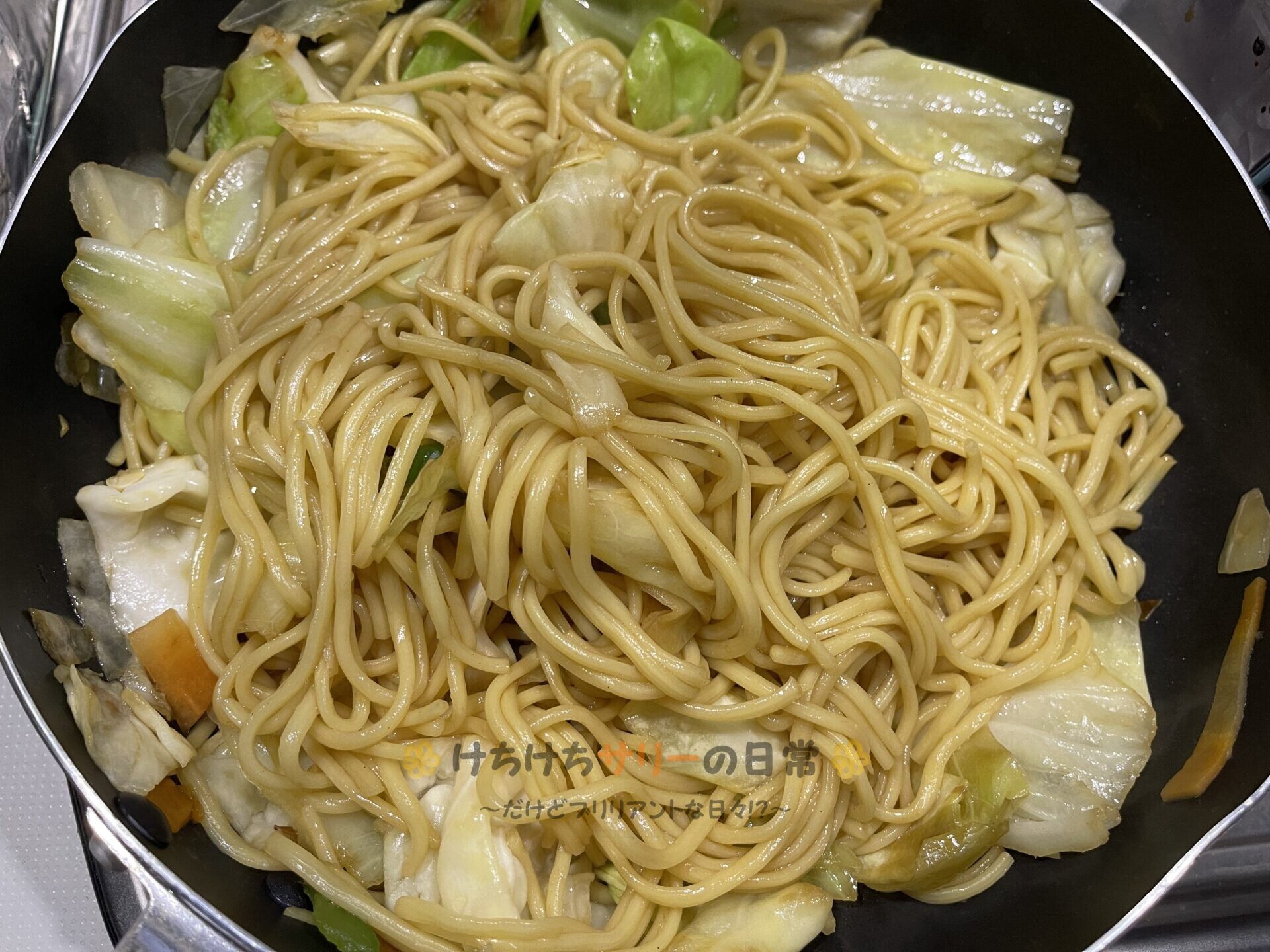 3割引でゲットした1袋21円の焼きそば麺を3袋入れてソースと絡めたらできあがり!