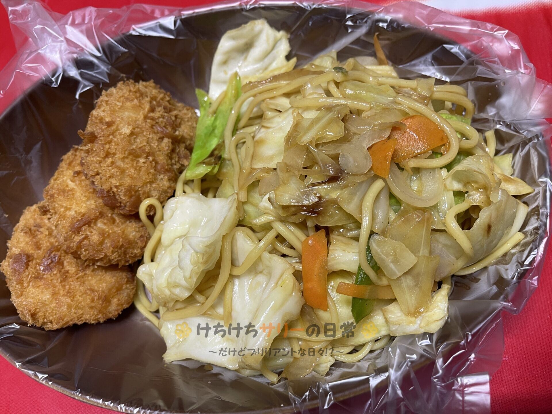 この日の夕ご飯は「野菜たっぷりの焼きそば」と「富山県産白えび使用白えびの揚げ物:半額で215円」だよ。