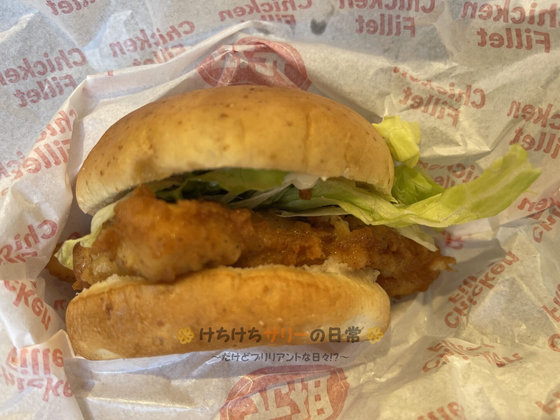 バーガーのチキンフィレはバンズからはみ出すぐらい大きくて満足度が高いね😁