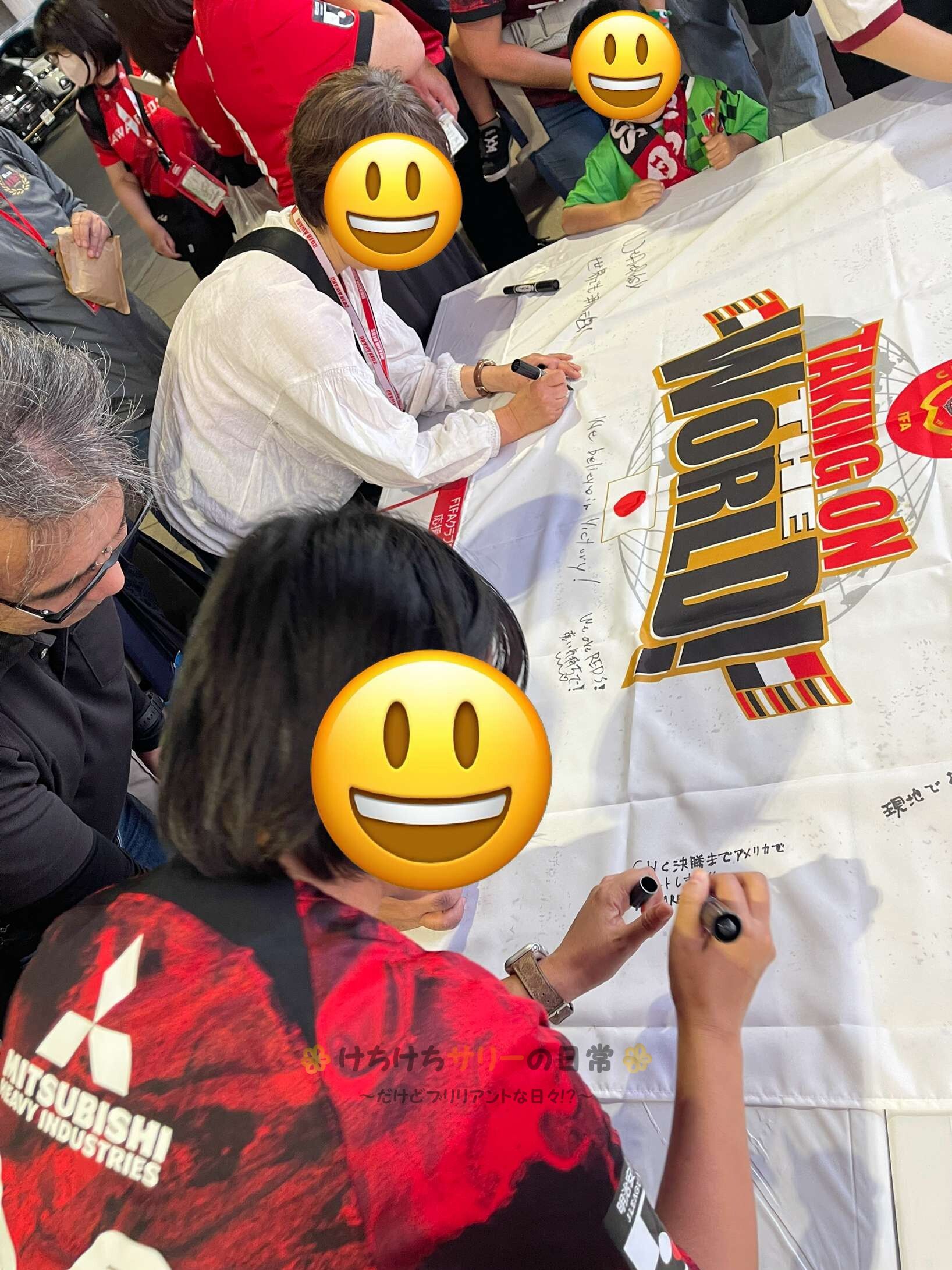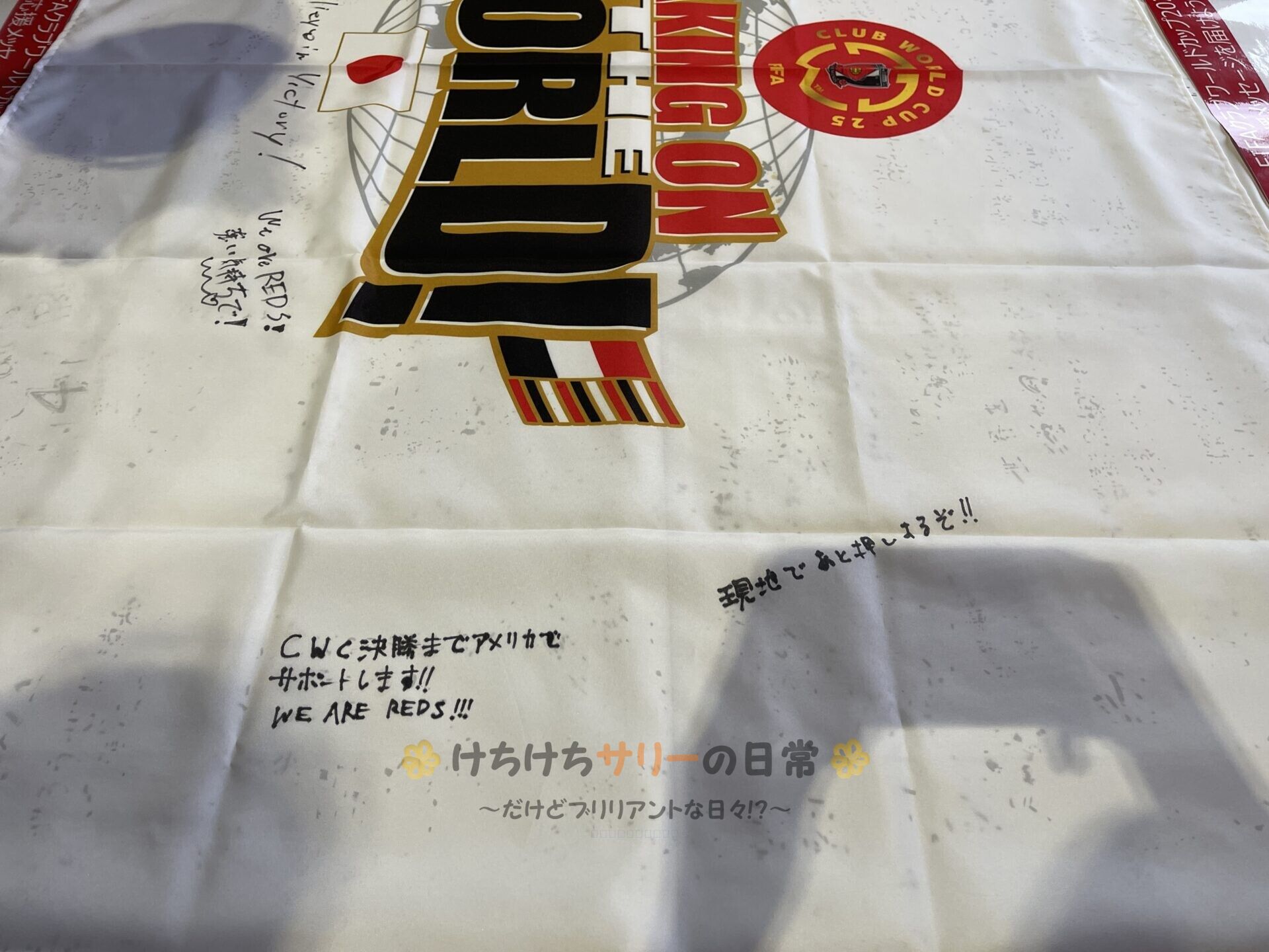 なんかペンのインクがにじんで綺麗な字で書けなかったけど『CWC(クラブワールドカップ)決勝までアメリカでサポートします!!WE ARE REDS!!』って書いておいたよ。 相方は『現地で後押しするぞ!!』っていうシンプルなメッセージ✨