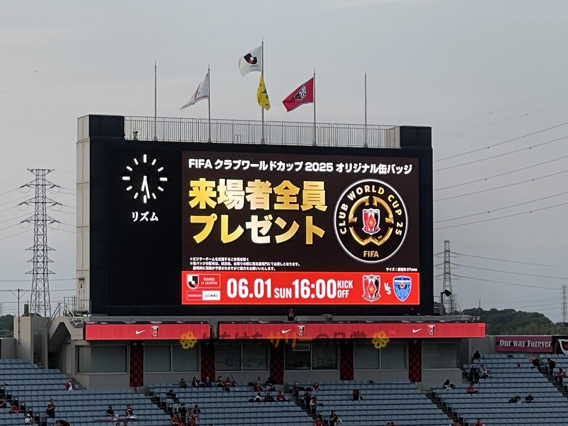 入場したら、浦和レッズのクラブワールドカップ壮行メッセージを応援旗に書く取り組みをやってたから、もちろん愛情込めてメッセージを書いた💖