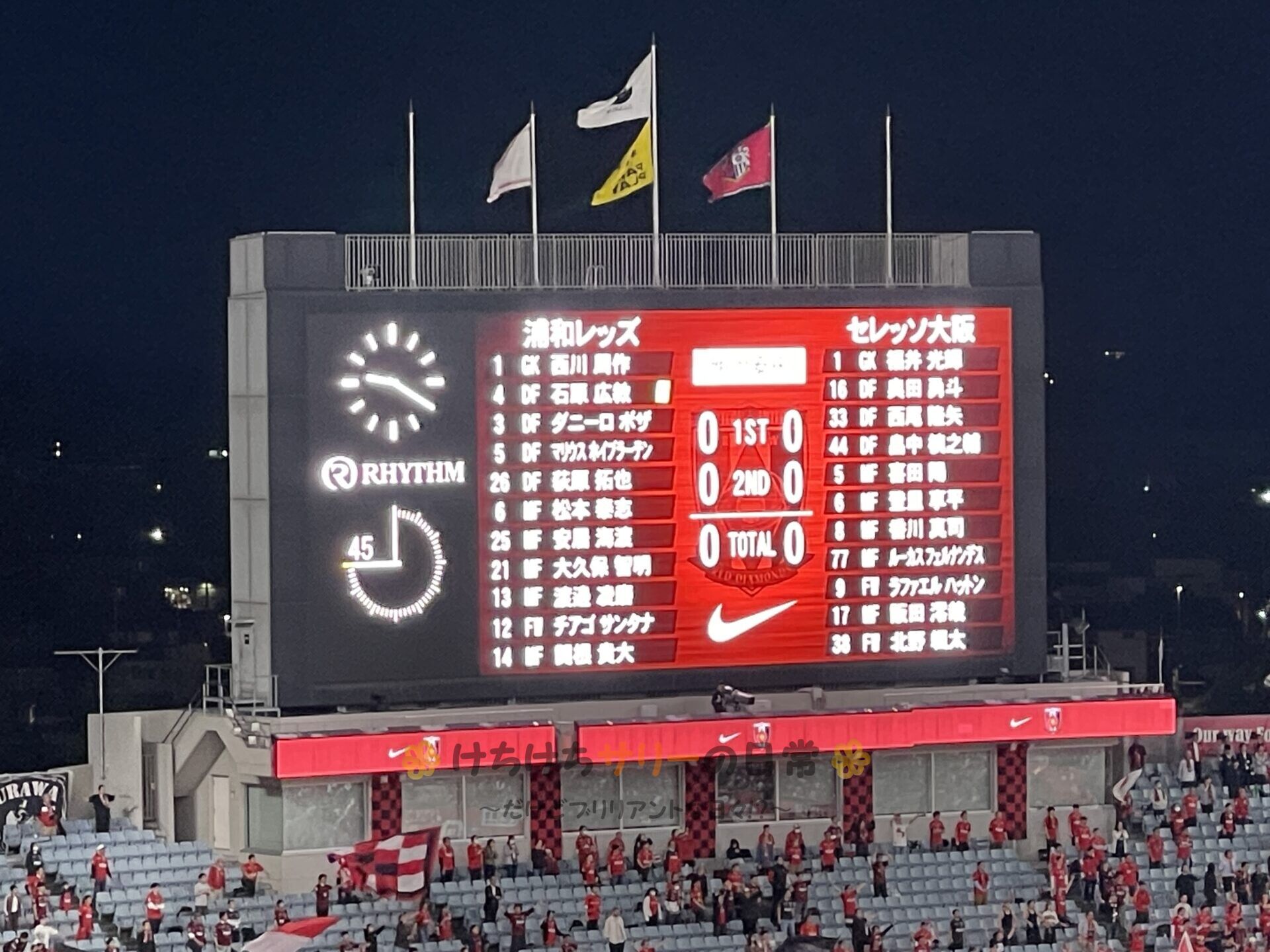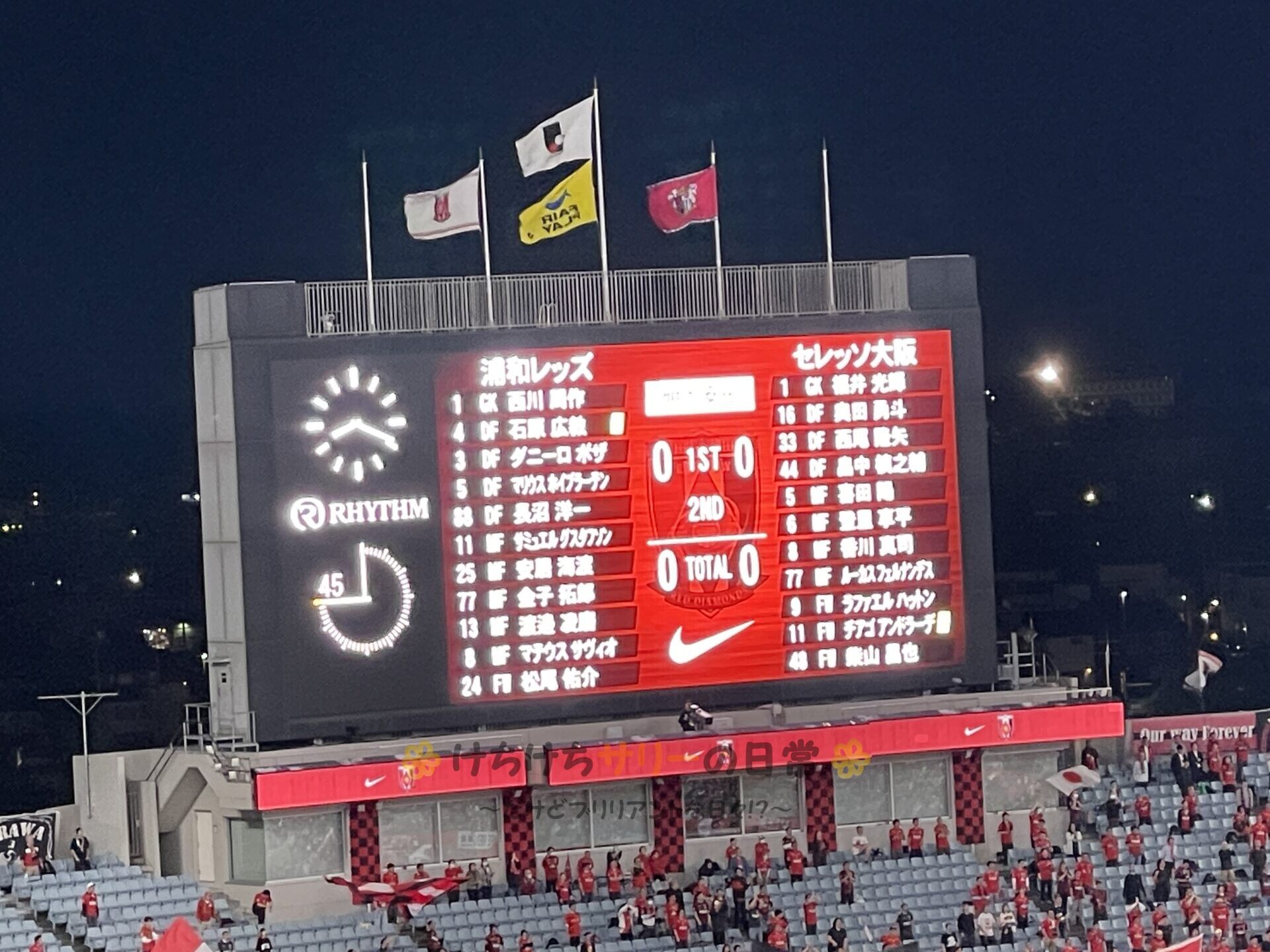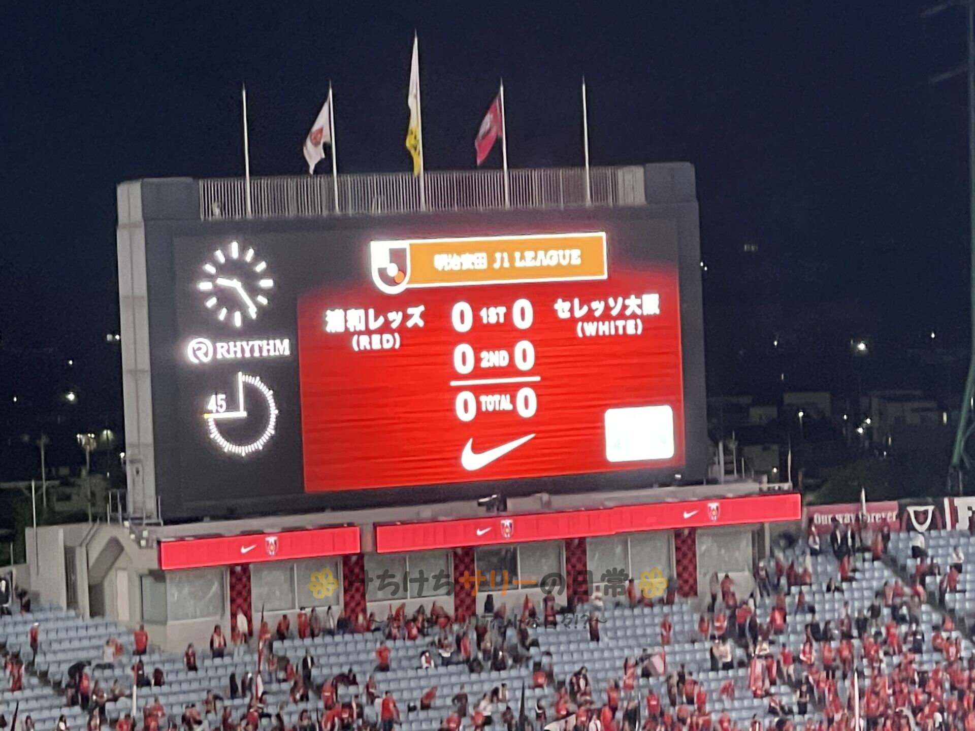 さぁ、いよいよキックオフだよ! 仕事が終わって駆け付けるサポーターがどんどん増えて、気が付いたら席がめっちゃ埋まってる😮