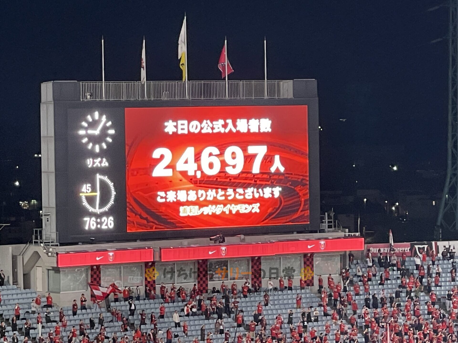この日の入場者数は24,697人😮 平日だというのに、ゴールデンウィークの富山戦(4,803人)の5倍も応援に来てるよ! これぞ日本一、いや、世界一と言われる浦和サポだね😤