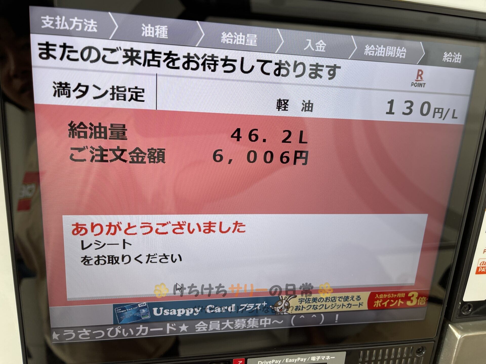 満タン給油で46.2リットル入れて会計は6,006円だった。